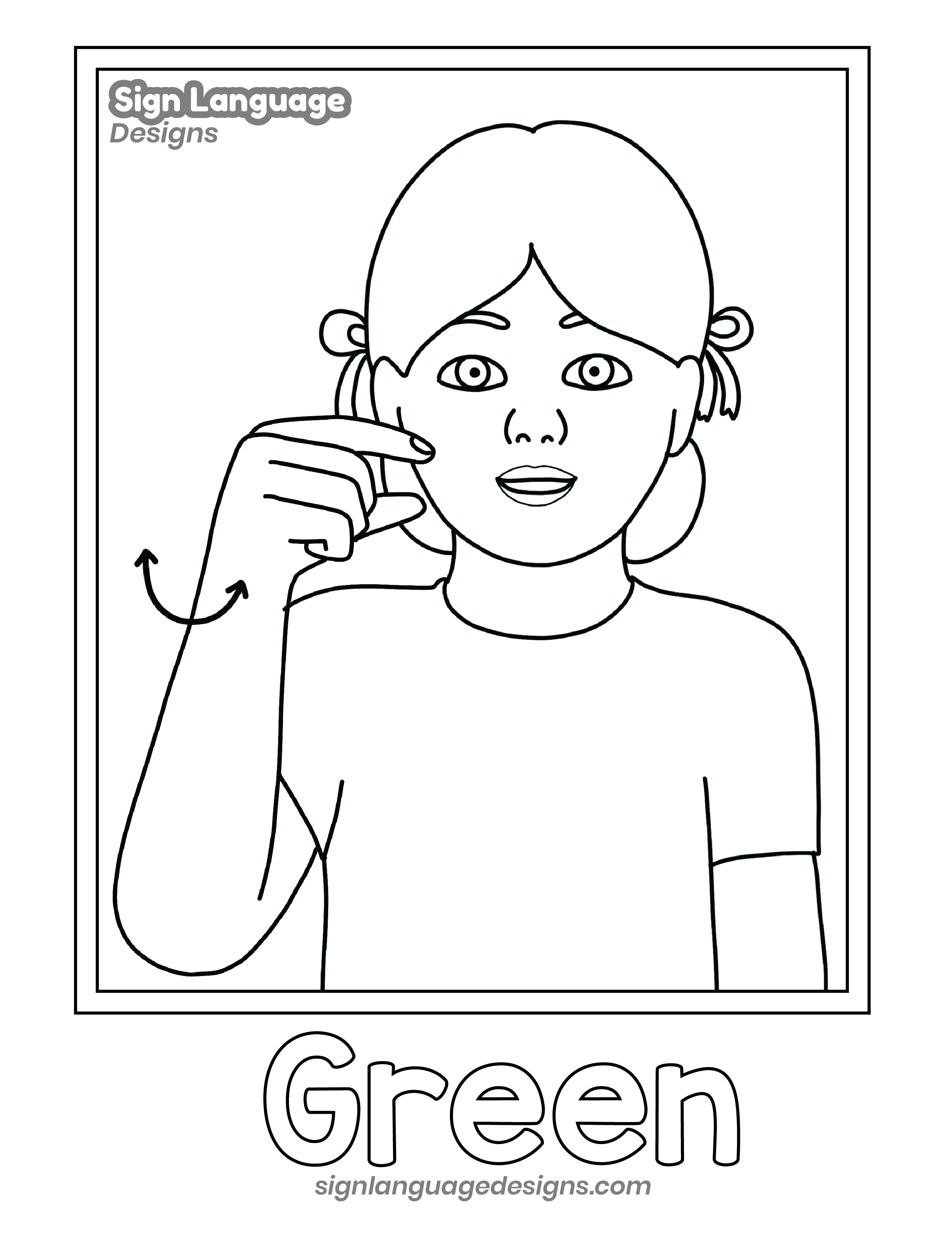 Free ASL sign poster featuring the ASL sign for the color green. This is a black and white poster which is ink-friendly and also can be used as a coloring page. We have color versions available too.