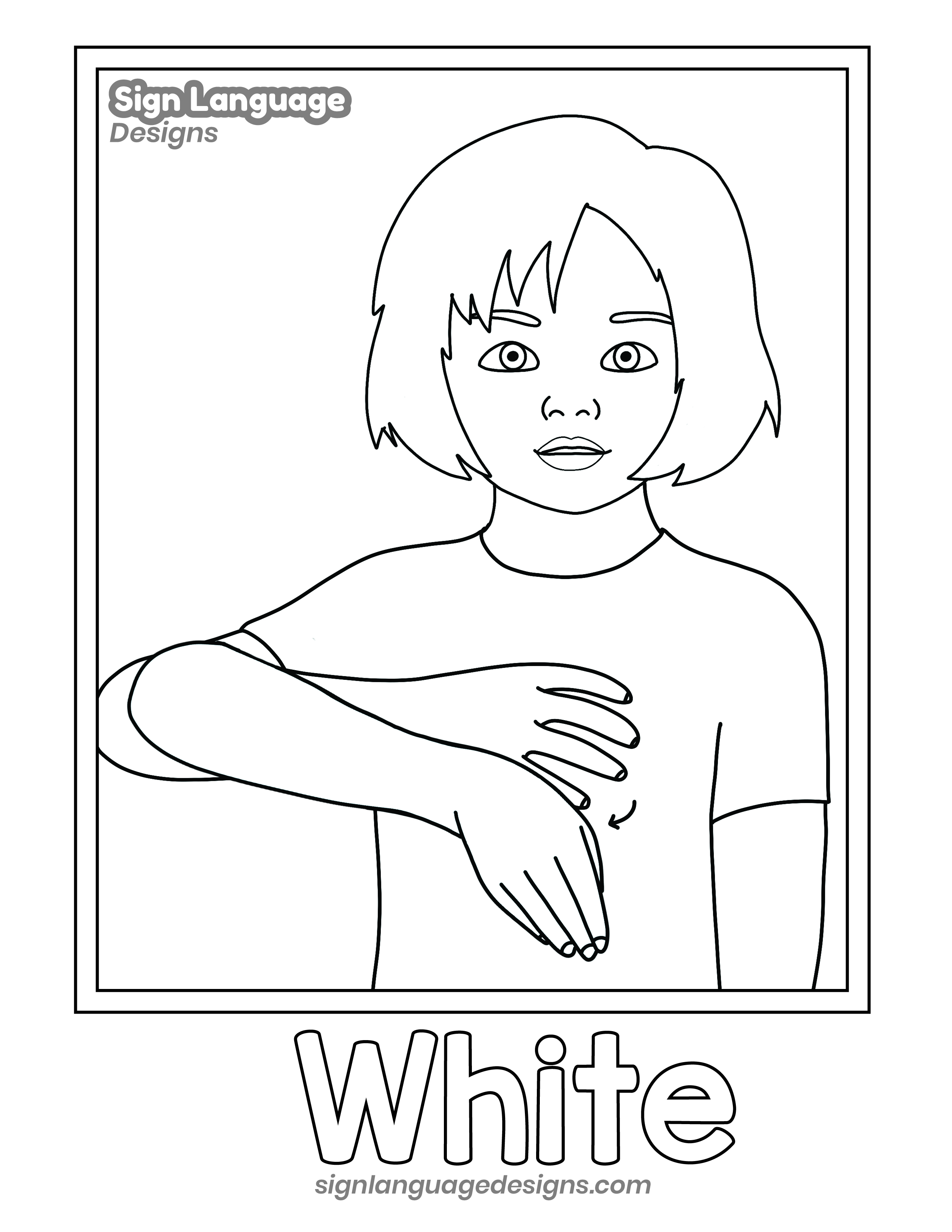 Free ASL sign poster featuring the ASL sign for the color white. This is a black and white poster which is ink-friendly and also can be used as a coloring page. We have color versions available too.