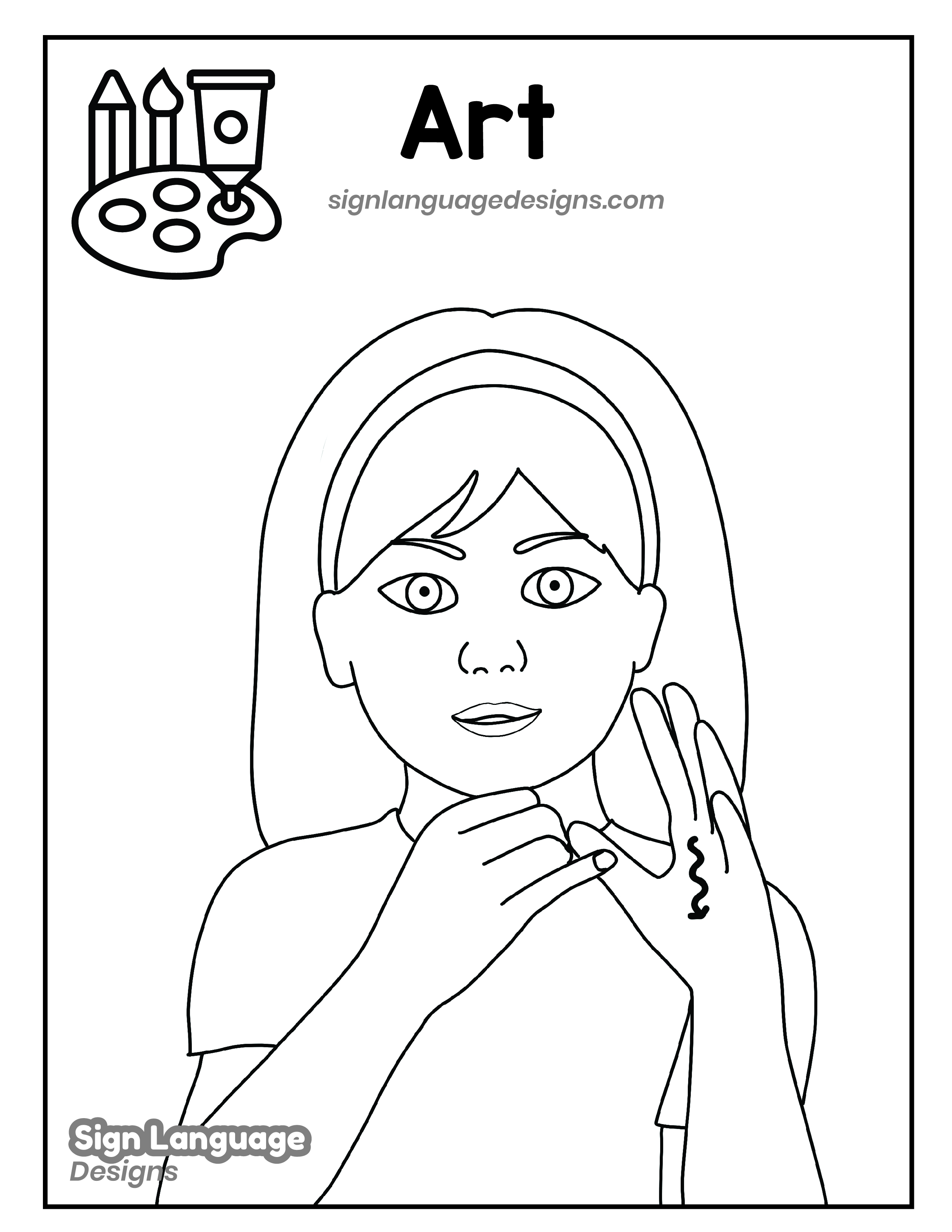 Free ASL sign poster featuring the ASL sign for the word art. This is a black and white poster which is both printer-friendly and also can be used as a coloring page. You’ll find we have color versions available for free download too HERE!