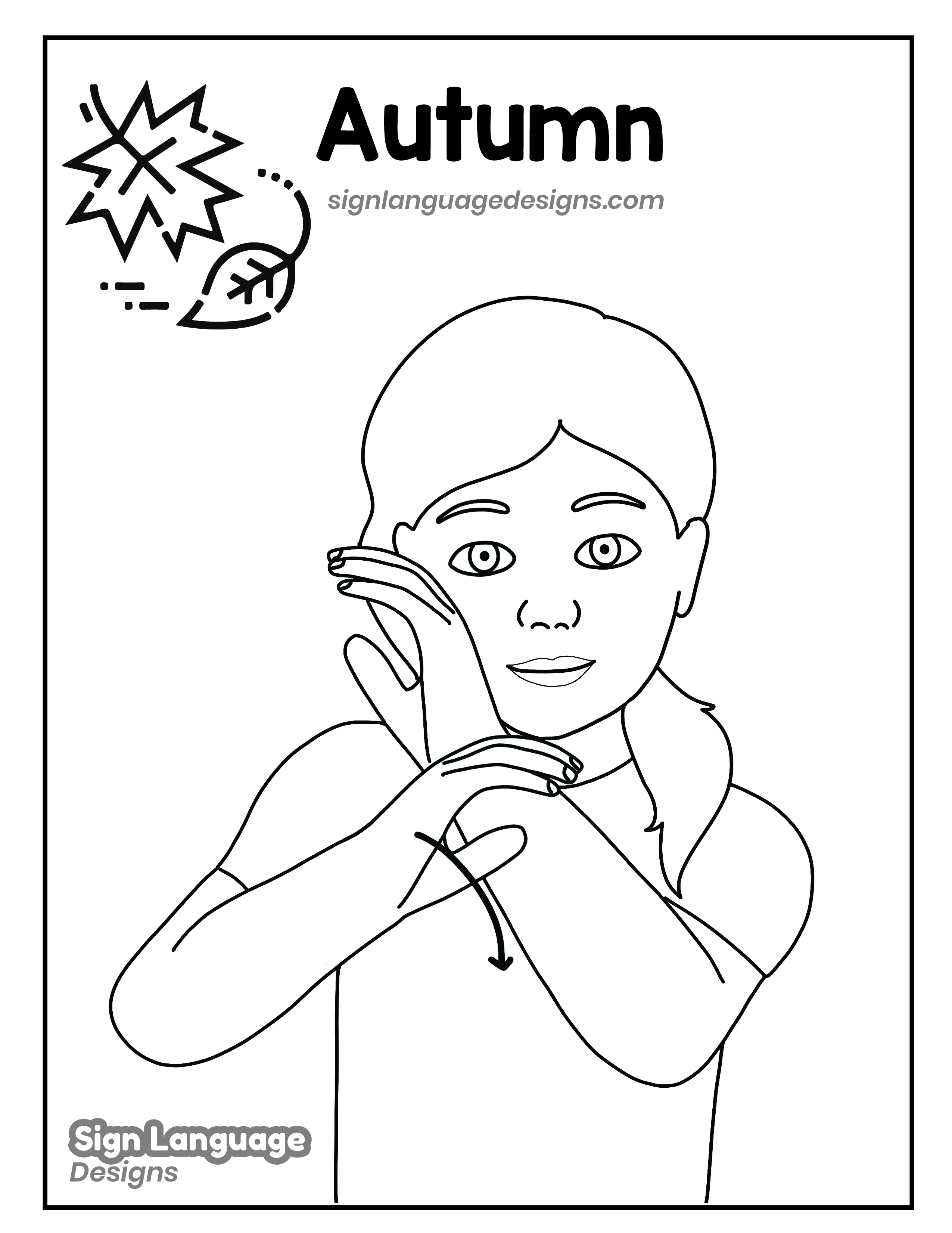 Free ASL sign poster featuring the ASL sign for the word autumn. This is a black and white poster which is both printer-friendly and also can be used as a coloring page. You’ll find we have color versions available for free download too HERE!