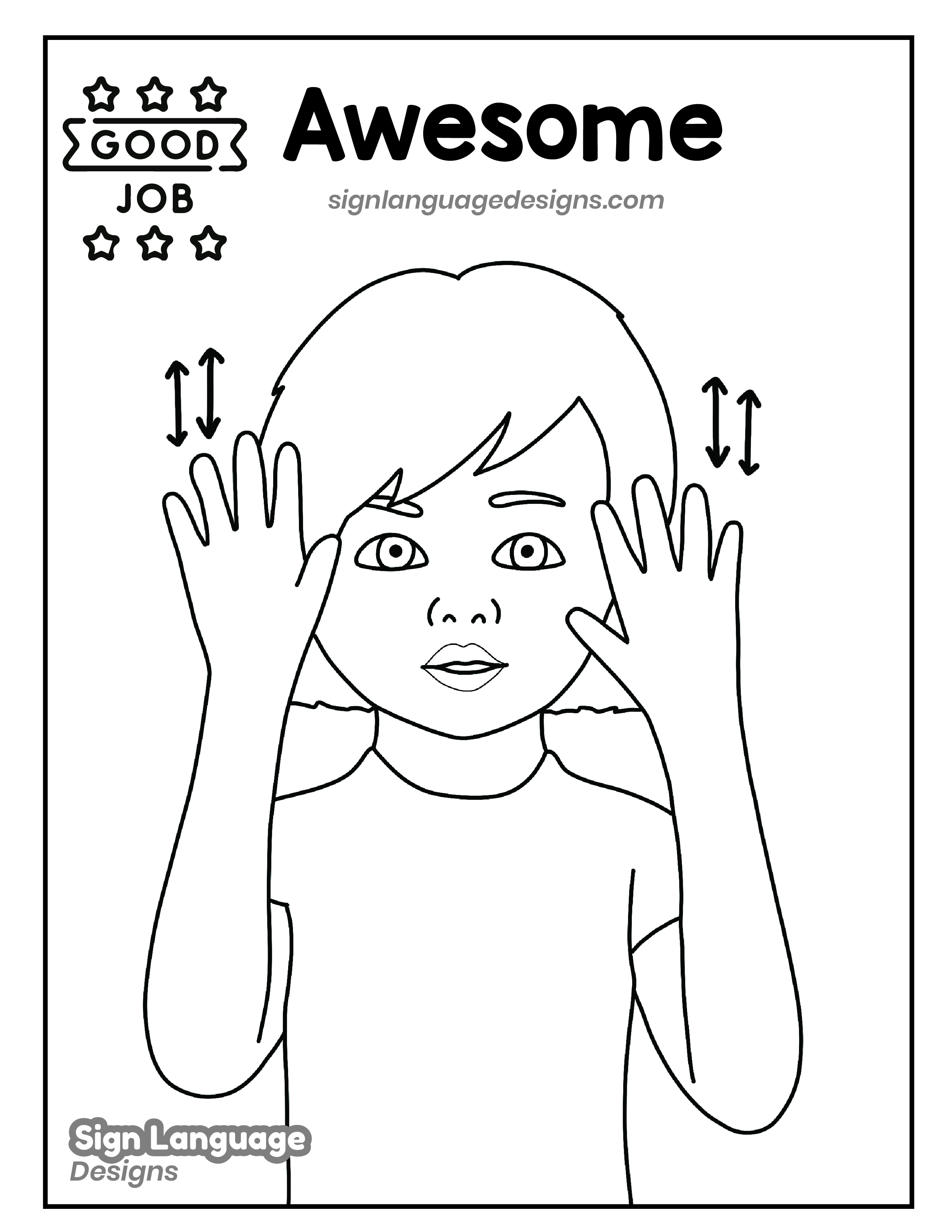 Free ASL sign poster featuring the ASL sign for the word awesome. This is a black and white poster which is both printer-friendly and also can be used as a coloring page. You’ll find we have color versions available for free download too HERE!