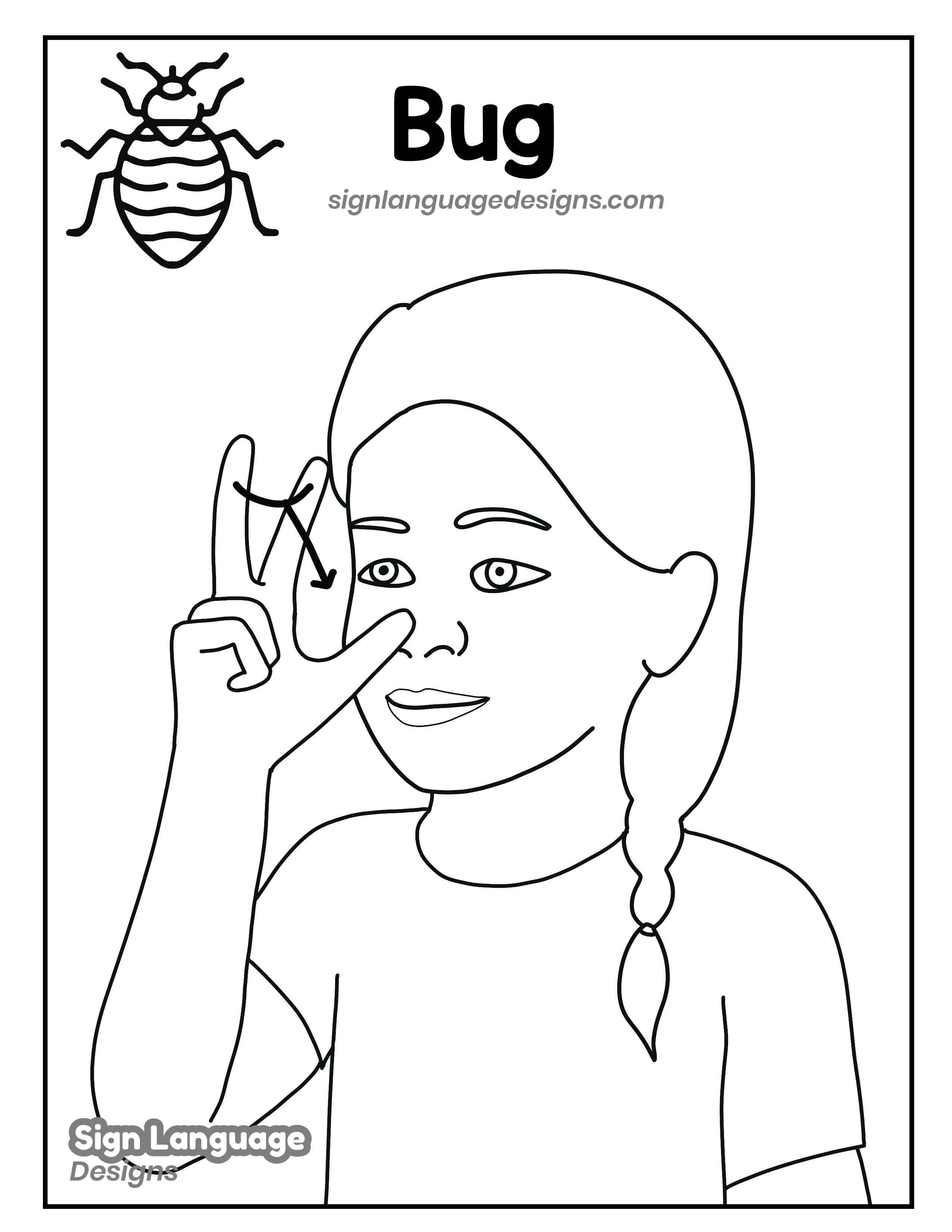 Free ASL sign poster featuring the ASL sign for the word bug. This is a black and white poster which is both printer-friendly and also can be used as a coloring page. You’ll find we have color versions available for free download too HERE!