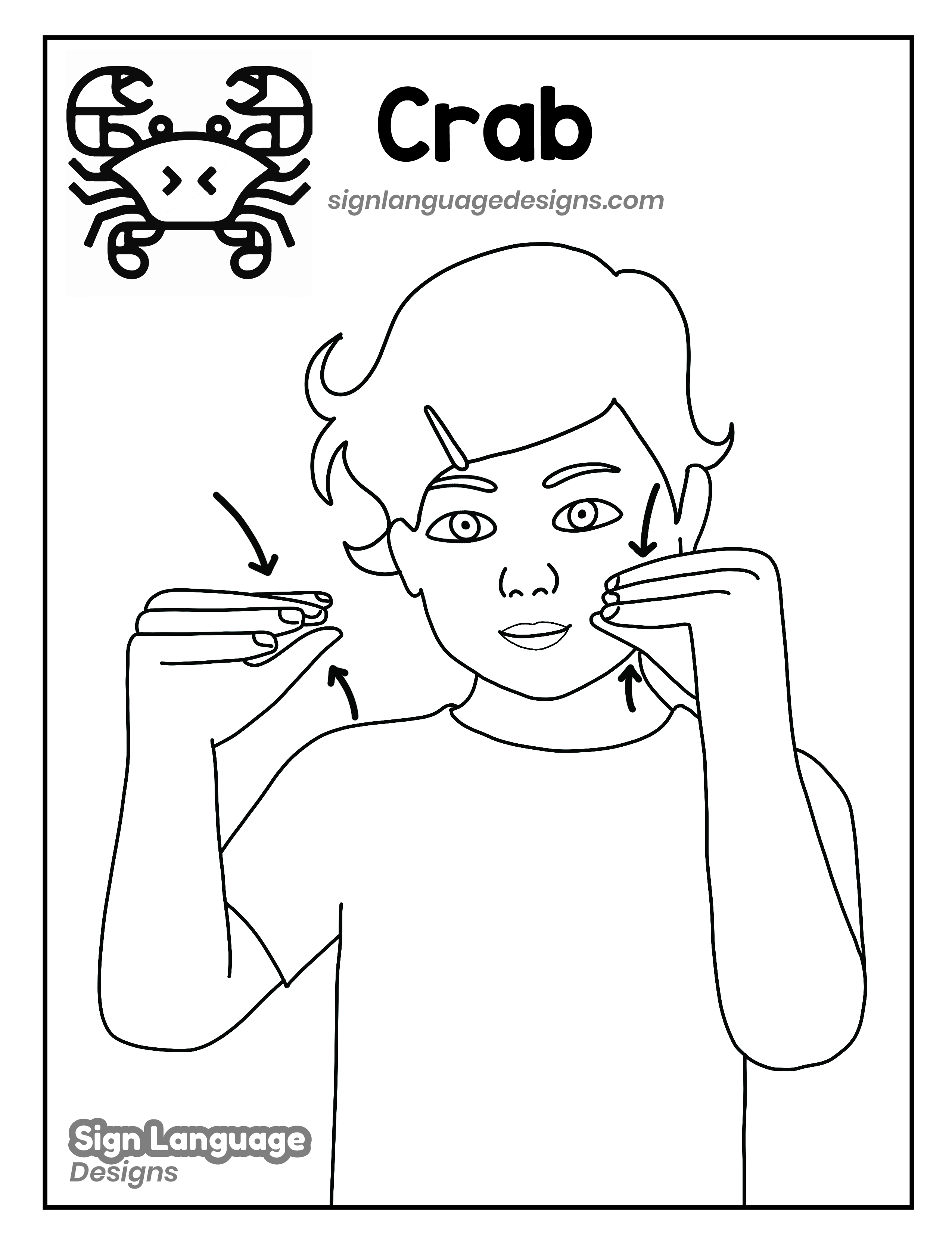 Free ASL sign poster featuring the ASL sign for the word crab. This is a black and white poster which is both printer-friendly and also can be used as a coloring page. You’ll find we have color versions available for free download too HERE!