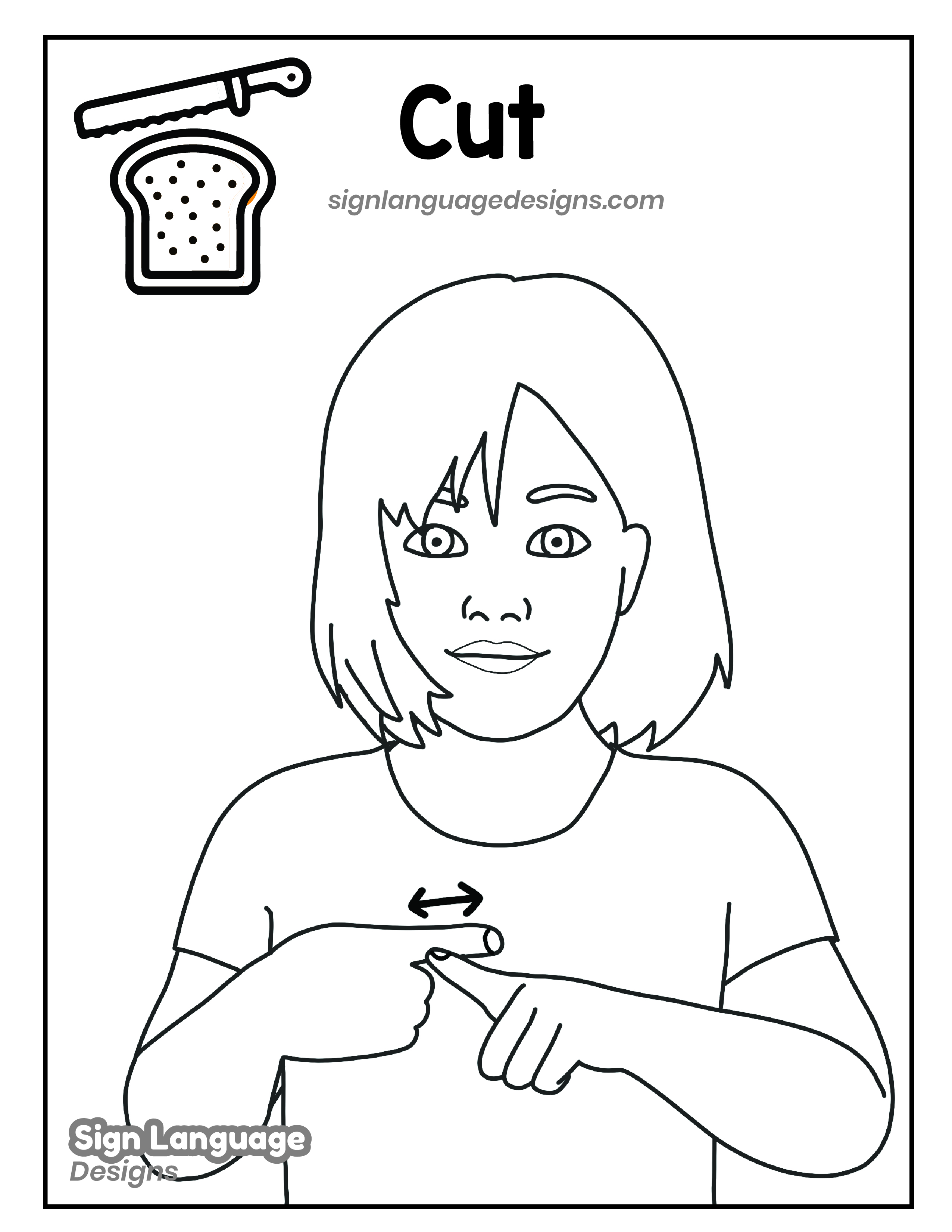 Free ASL sign poster featuring the ASL sign for the word cut. This is a black and white poster which is both printer-friendly and also can be used as a coloring page. You’ll find we have color versions available for free download too HERE!