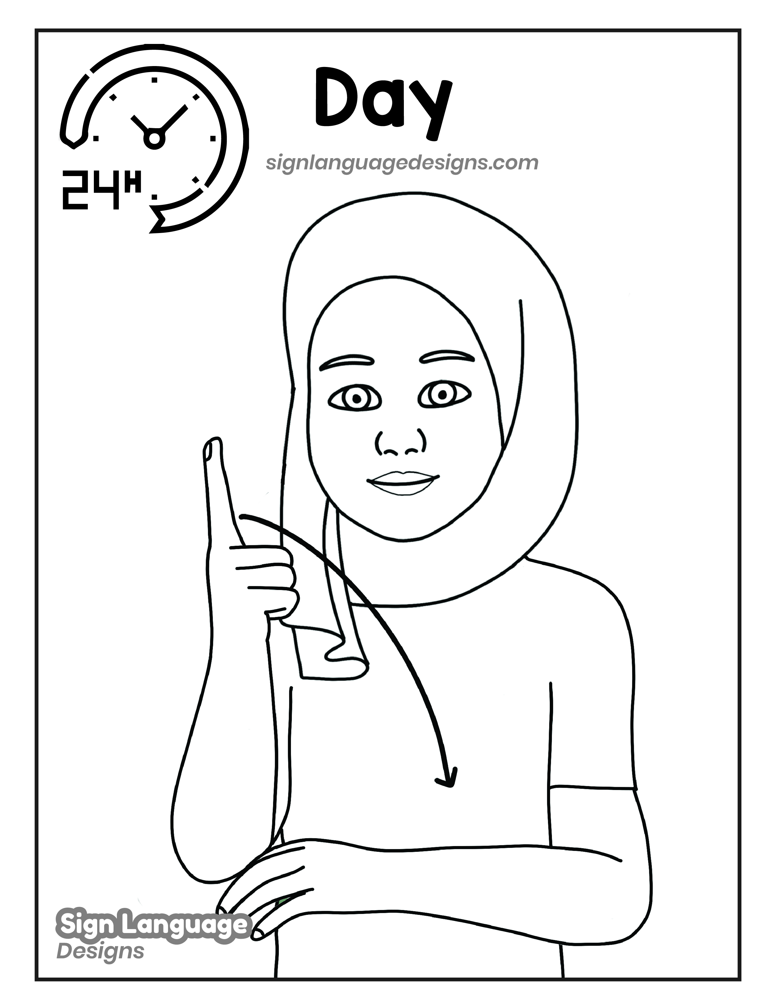 Free ASL sign poster featuring the ASL sign for the word day. This is a black and white poster which is both printer-friendly and also can be used as a coloring page. You’ll find we have color versions available for free download too HERE!