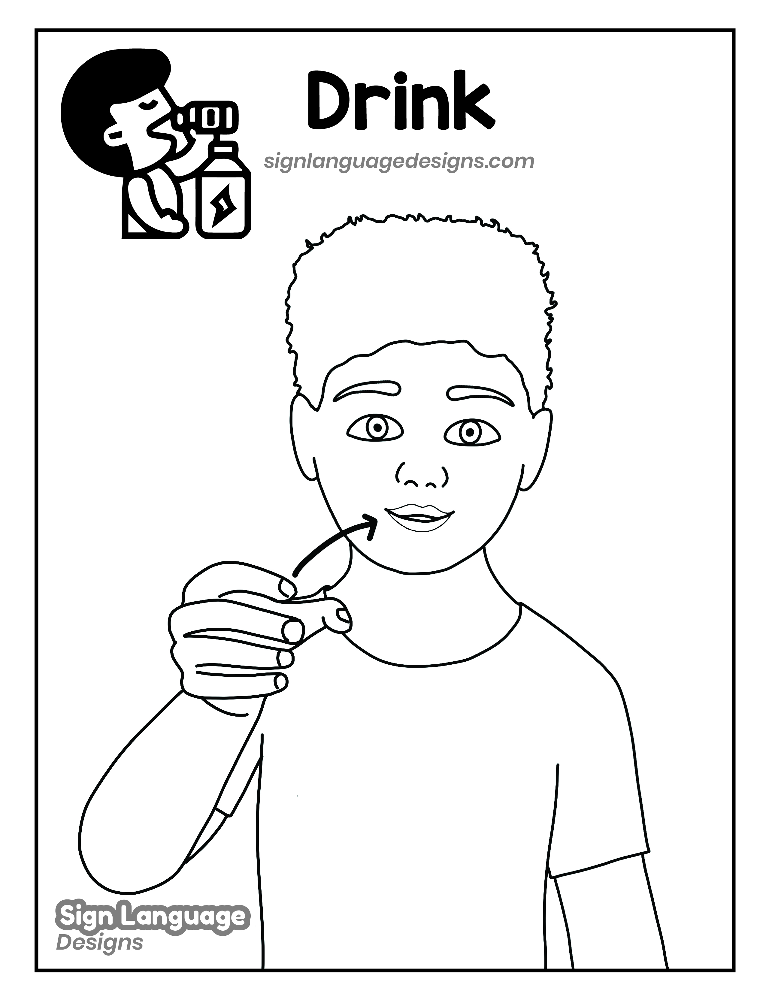 Free ASL sign poster featuring the ASL sign for the word drink. This is a black and white poster which is both printer-friendly and also can be used as a coloring page. You’ll find we have color versions available for free download too HERE!