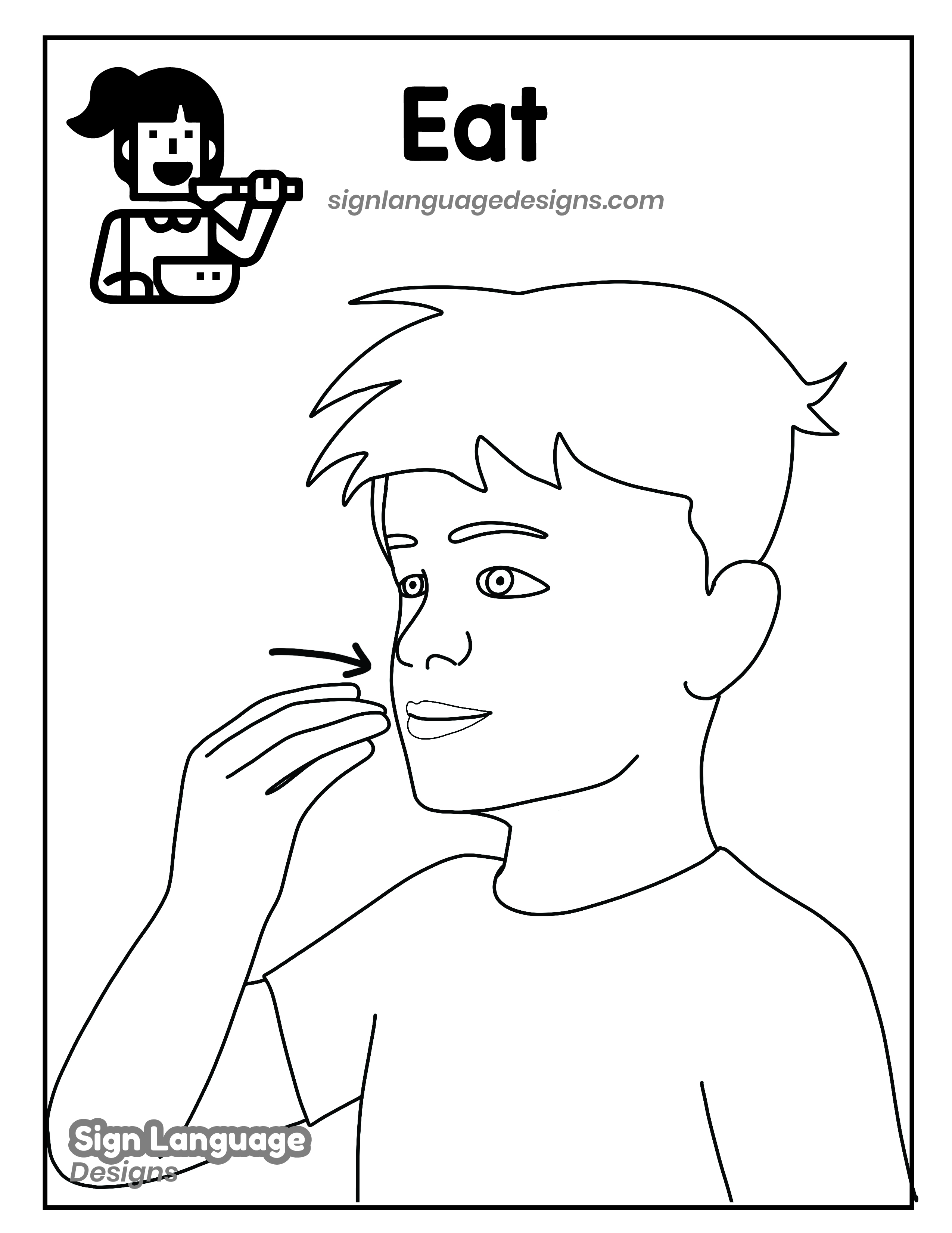 Free ASL sign poster featuring the ASL sign for the word eat. This is a black and white poster which is both printer-friendly and also can be used as a coloring page. You’ll find we have color versions available for free download too HERE!