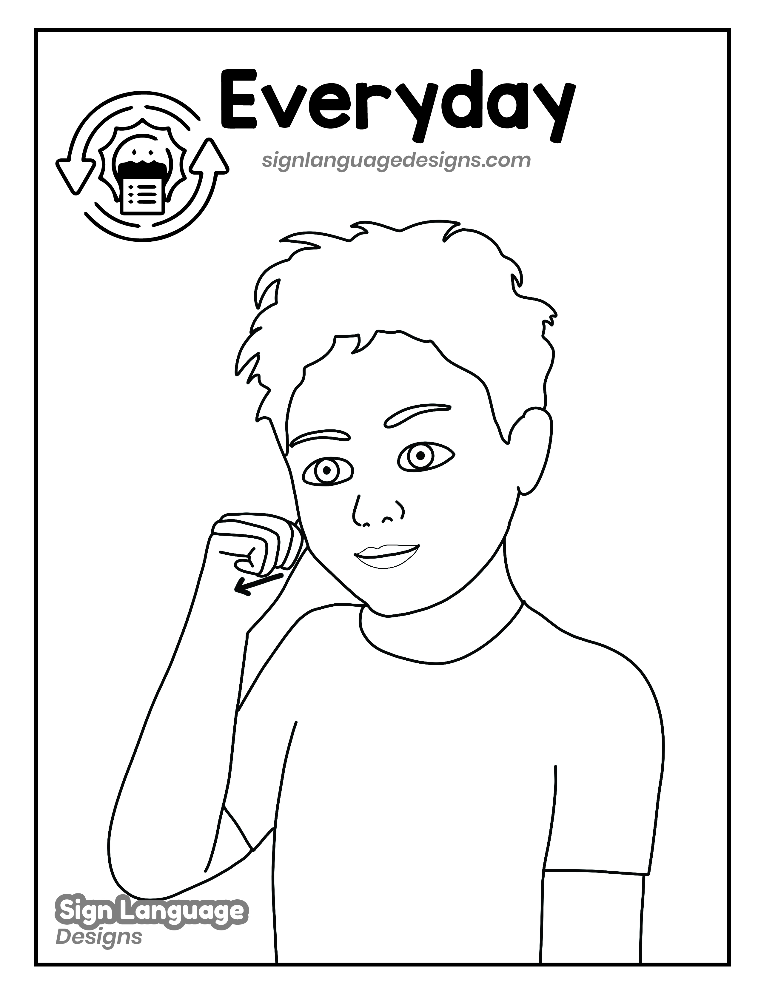 Free ASL sign poster featuring the ASL sign for the word everyday. This is a black and white poster which is both printer-friendly and also can be used as a coloring page. You’ll find we have color versions available for free download too HERE!
