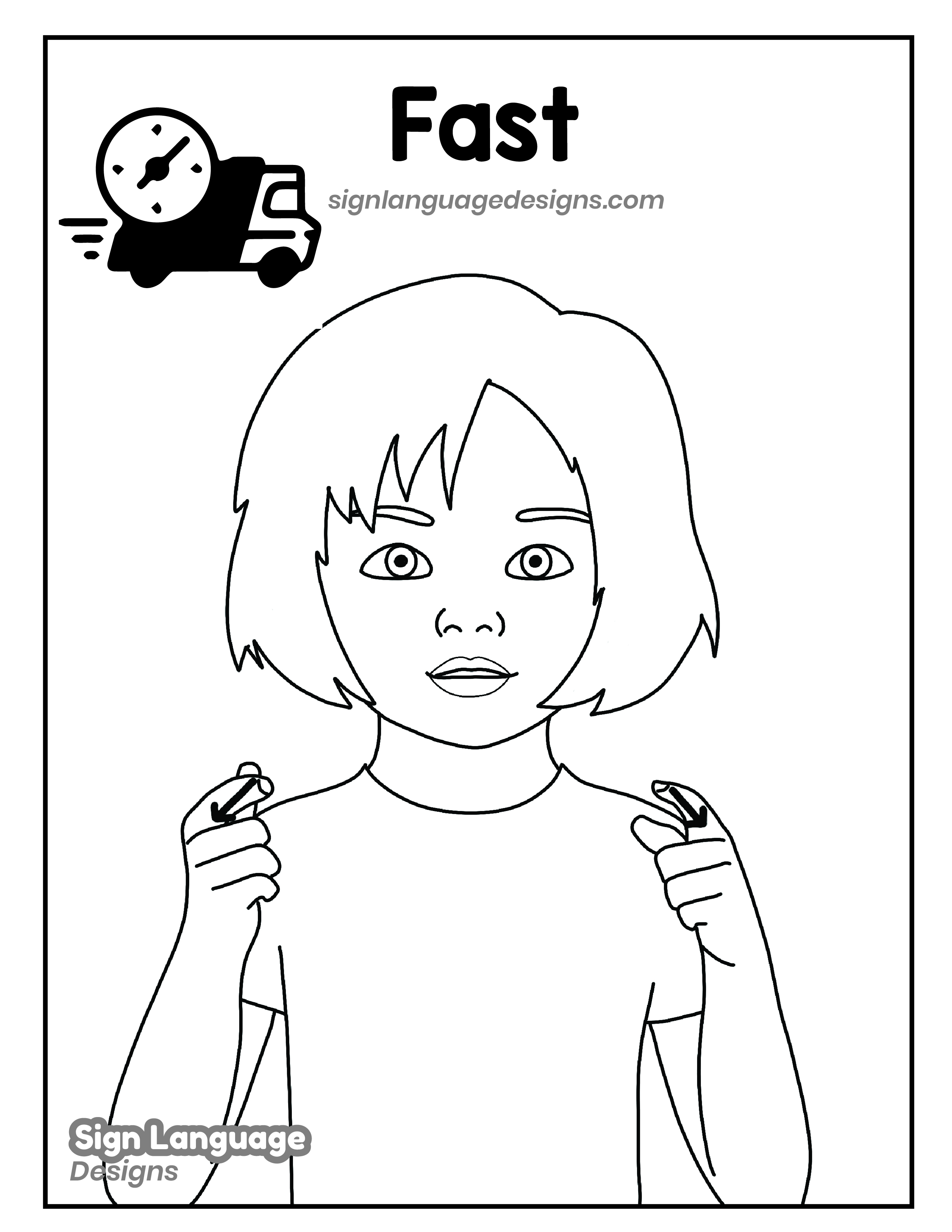Free ASL sign poster featuring the ASL sign for the word fast. This is a black and white poster which is both printer-friendly and also can be used as a coloring page. You’ll find we have color versions available for free download too HERE!