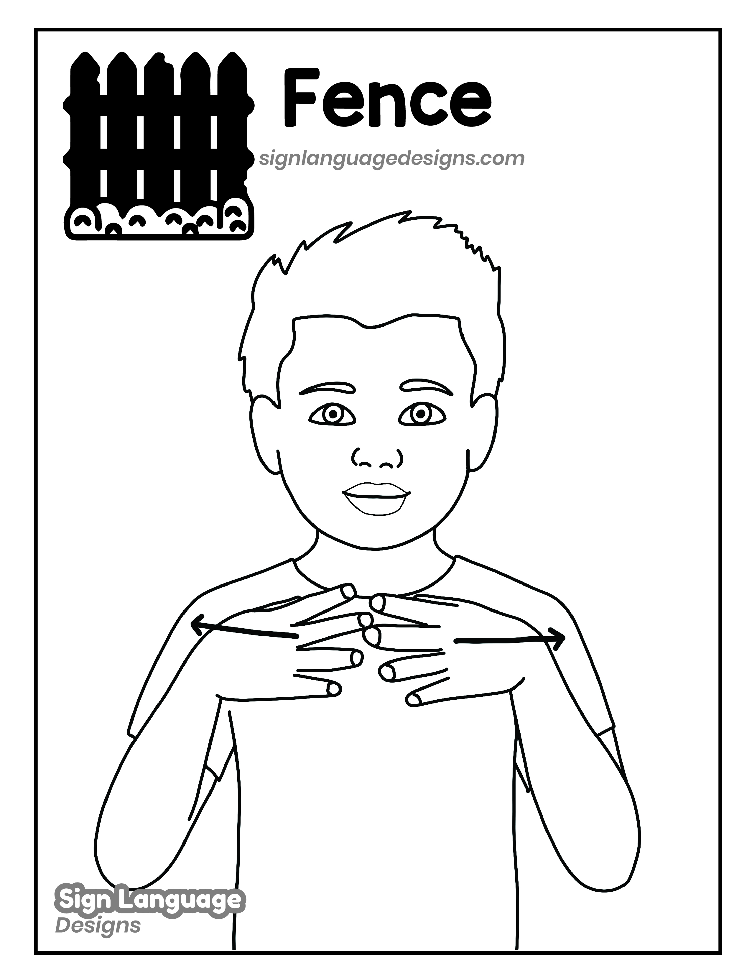 Free ASL sign poster featuring the ASL sign for the word fence. This is a black and white poster which is both printer-friendly and also can be used as a coloring page. You’ll find we have color versions available for free download too HERE!