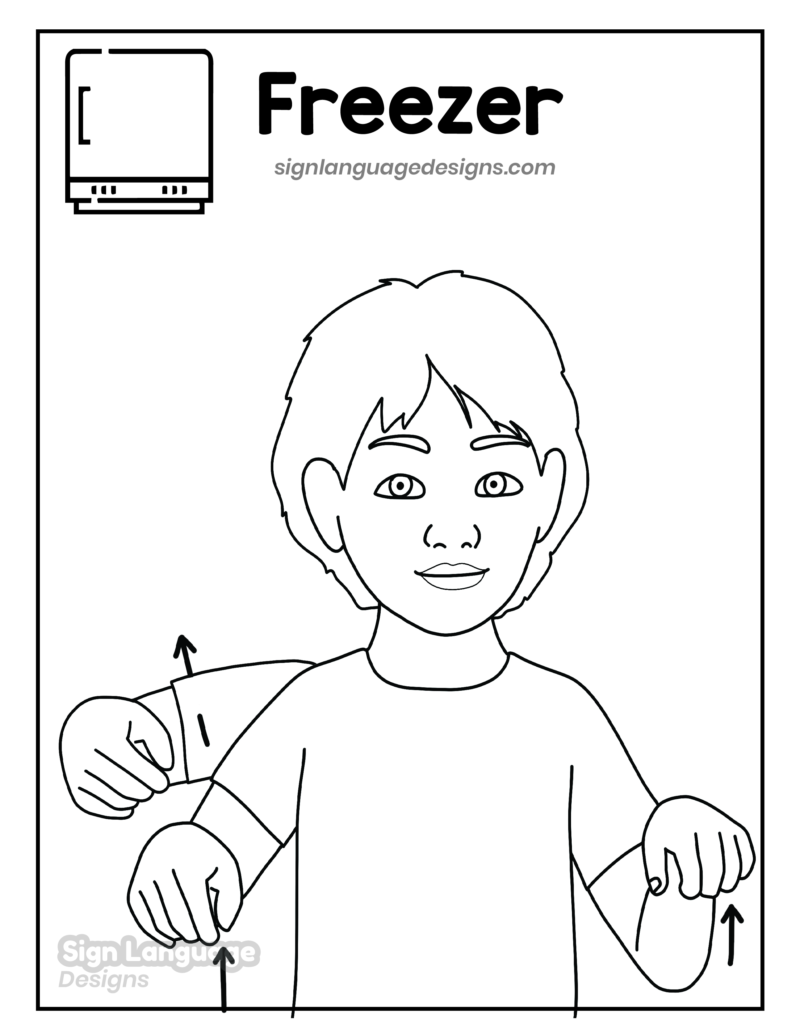 Free ASL sign poster featuring the ASL sign for the word freezer. This is a black and white poster which is both printer-friendly and also can be used as a coloring page. You’ll find we have color versions available for free download too HERE!