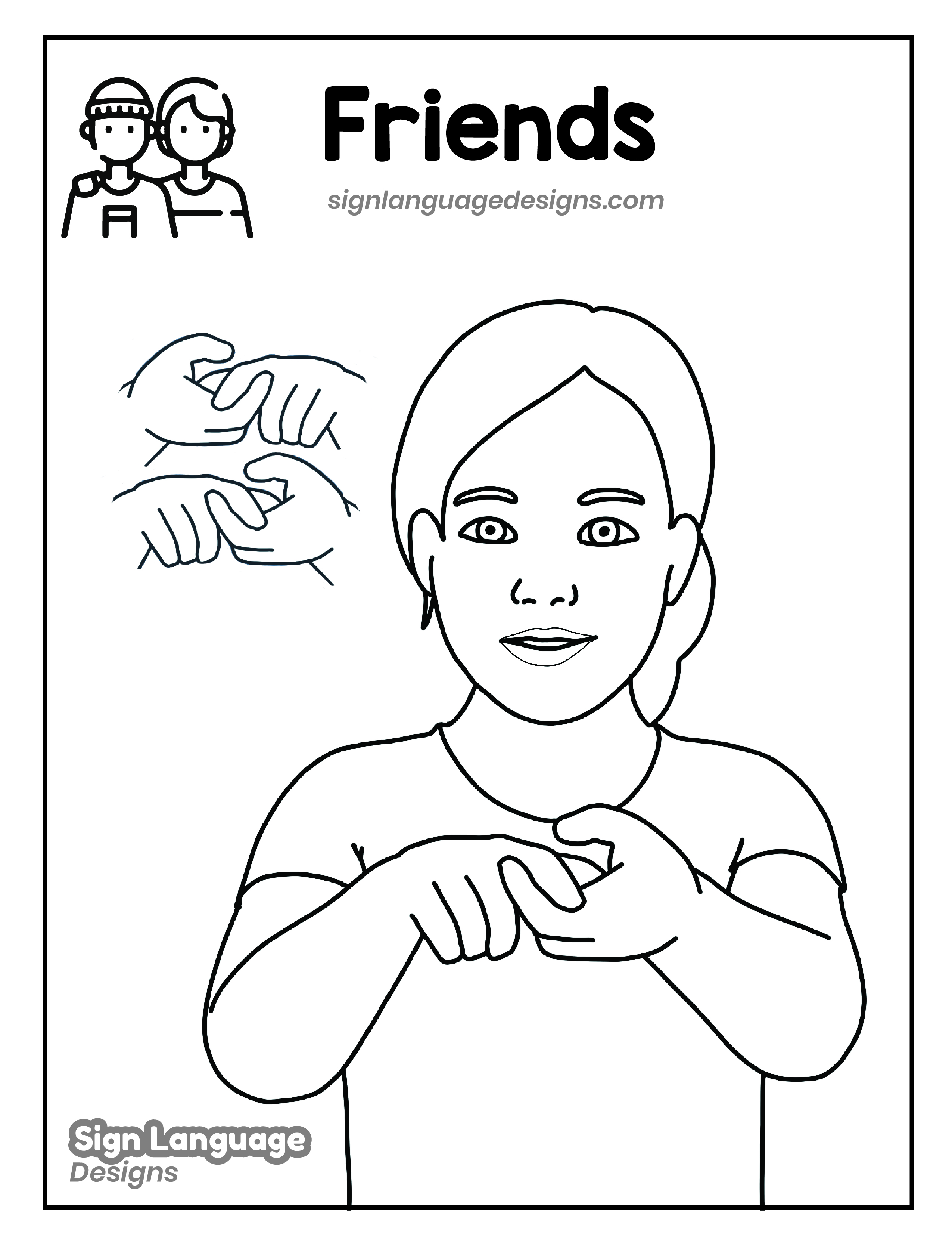 Free ASL sign poster featuring the ASL sign for the word friends. This is a black and white poster which is both printer-friendly and also can be used as a coloring page. You’ll find we have color versions available for free download too HERE!