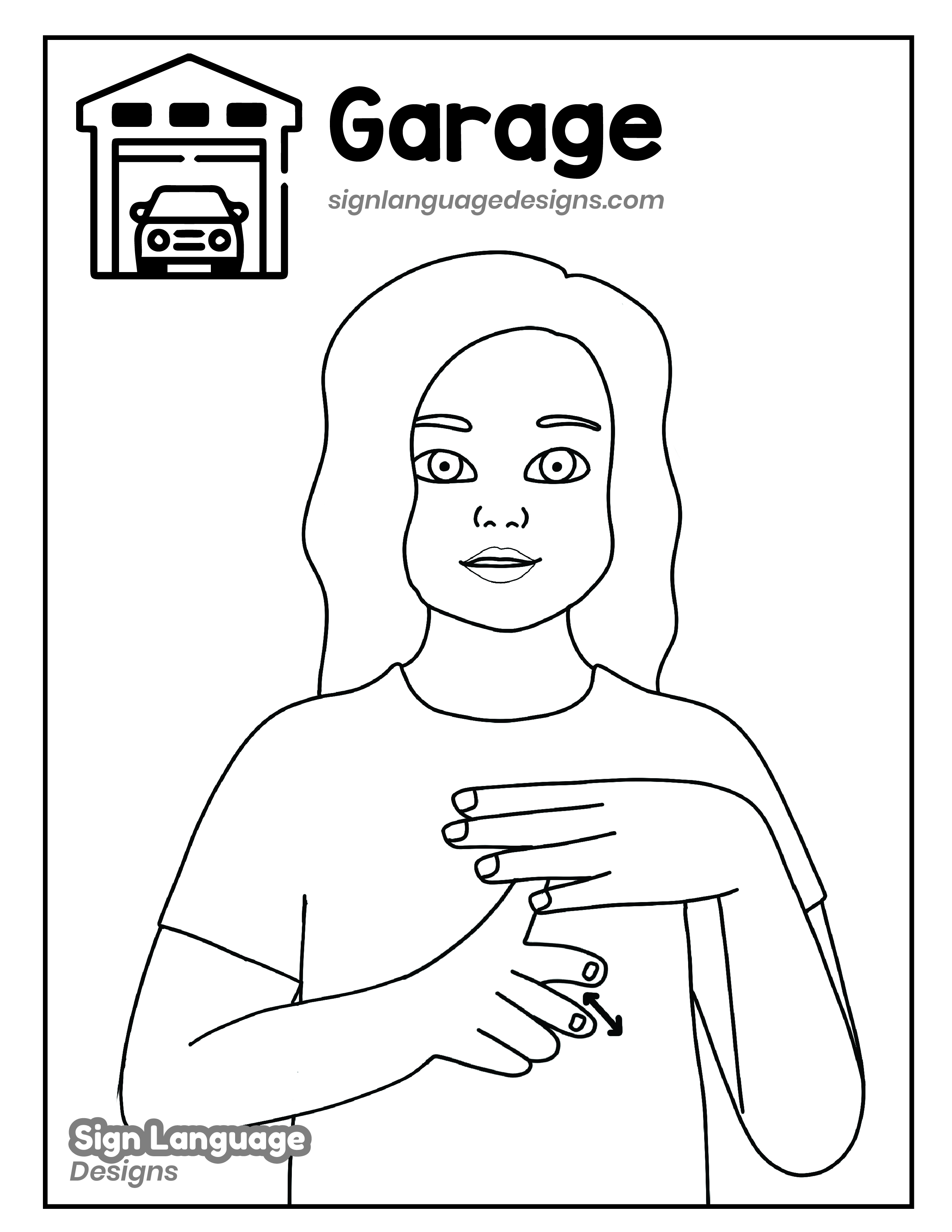 Free ASL sign poster featuring the ASL sign for the word garage. This is a black and white poster which is both printer-friendly and also can be used as a coloring page. You’ll find we have color versions available for free download too HERE!
