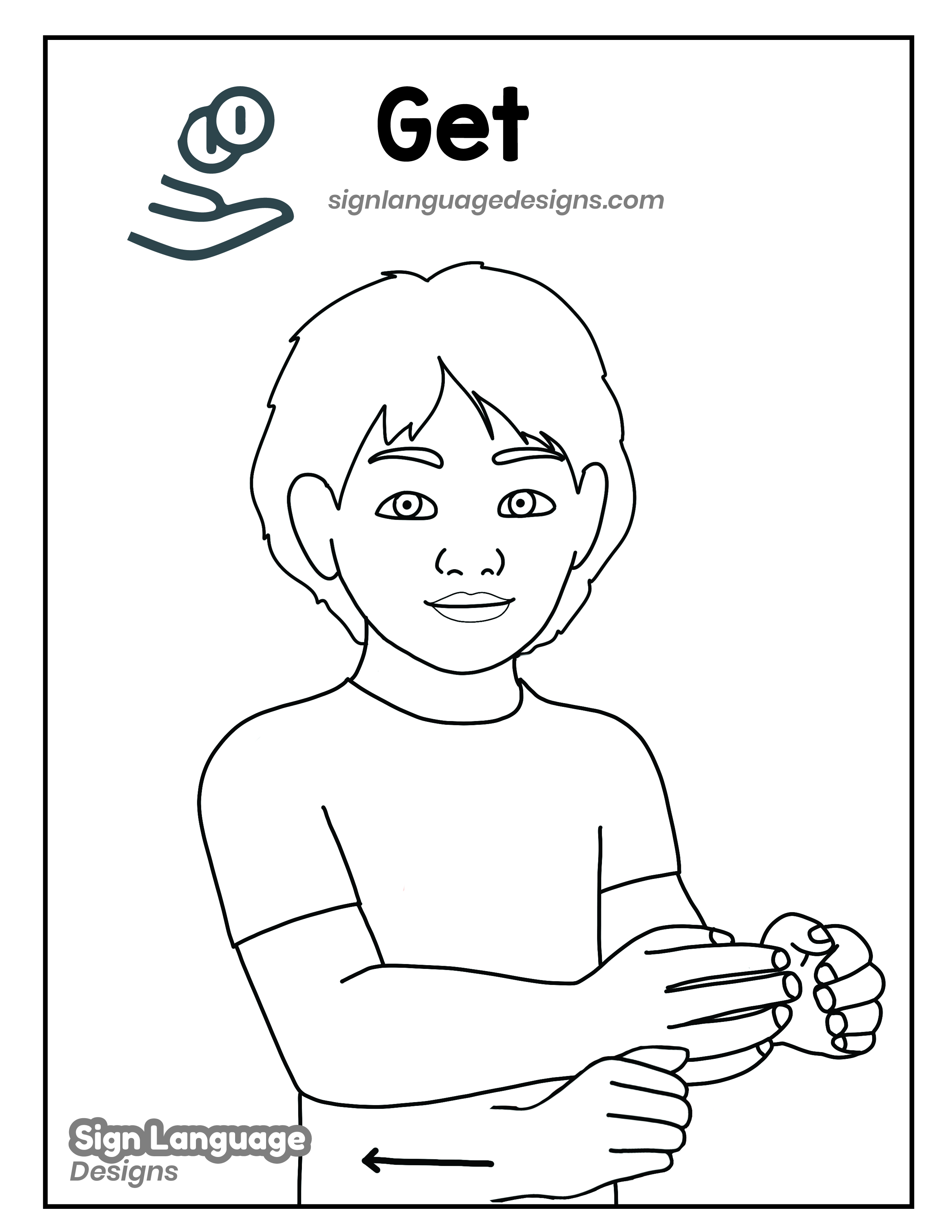 Free ASL sign poster featuring the ASL sign for the word get. This is a black and white poster which is both printer-friendly and also can be used as a coloring page. You’ll find we have color versions available for free download too HERE!
