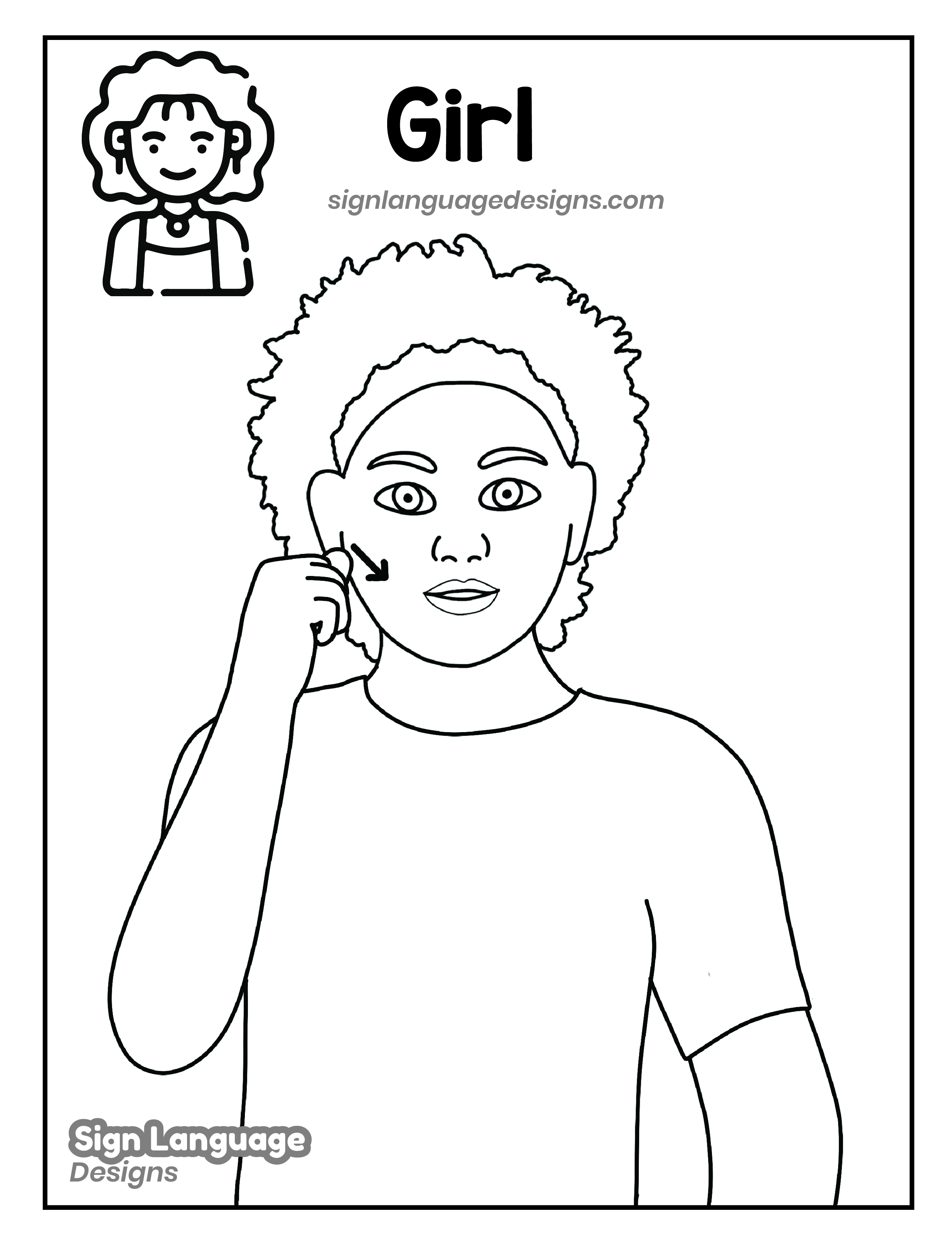 Free ASL sign poster featuring the ASL sign for the word girl. This is a black and white poster which is both printer-friendly and also can be used as a coloring page. You’ll find we have color versions available for free download too HERE!