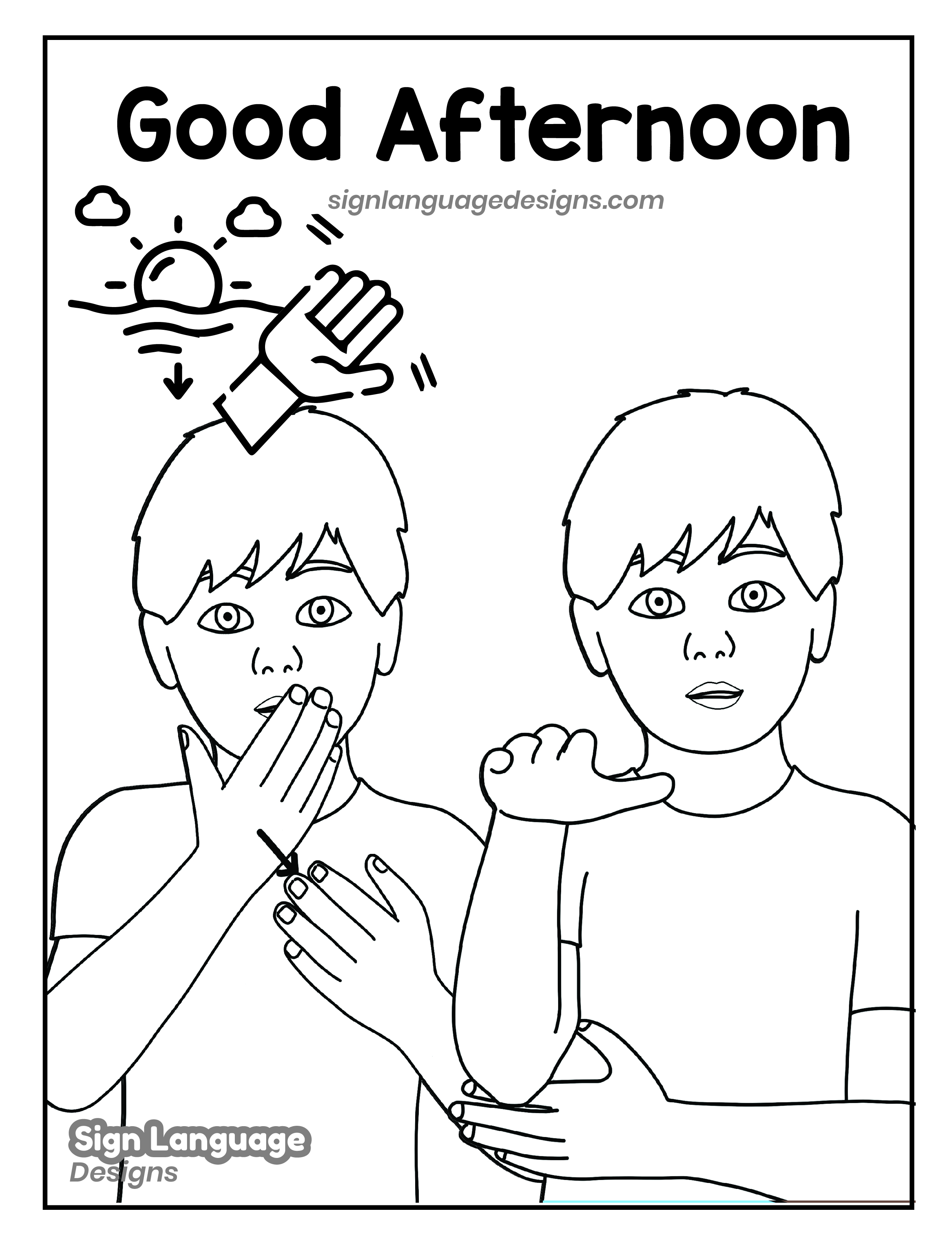 Free ASL sign poster featuring the ASL sign for the word good afternoon. This is a black and white poster which is both printer-friendly and also can be used as a coloring page. You’ll find we have color versions available for free download too HERE!