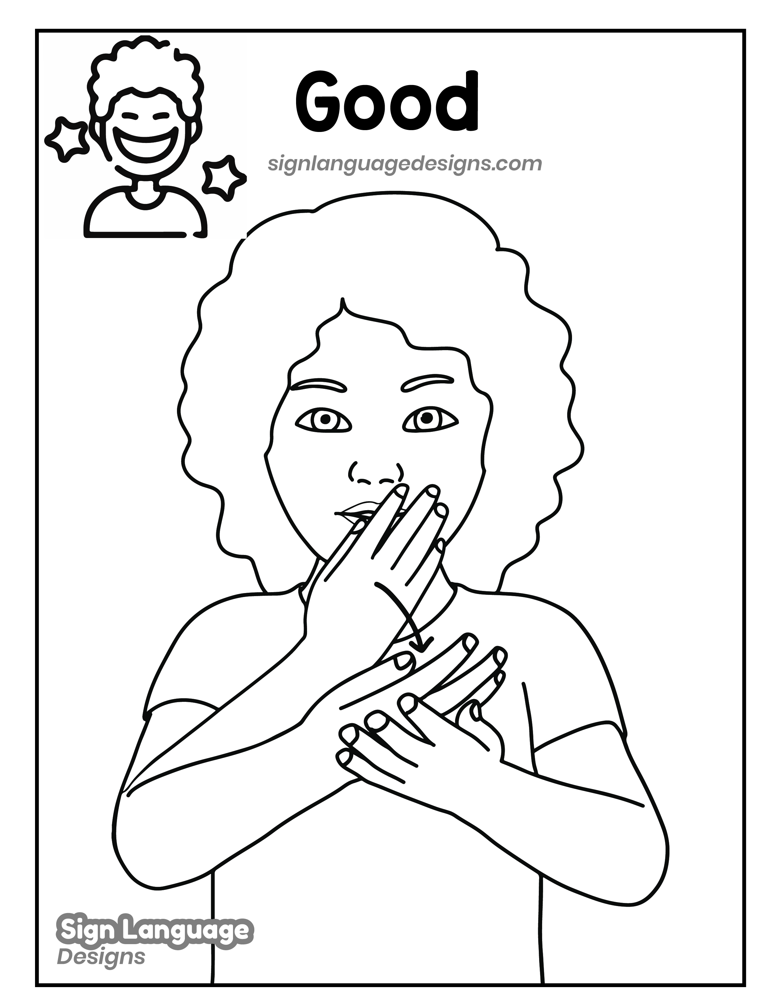 Free ASL sign poster featuring the ASL sign for the word good. This is a black and white poster which is both printer-friendly and also can be used as a coloring page. You’ll find we have color versions available for free download too HERE!