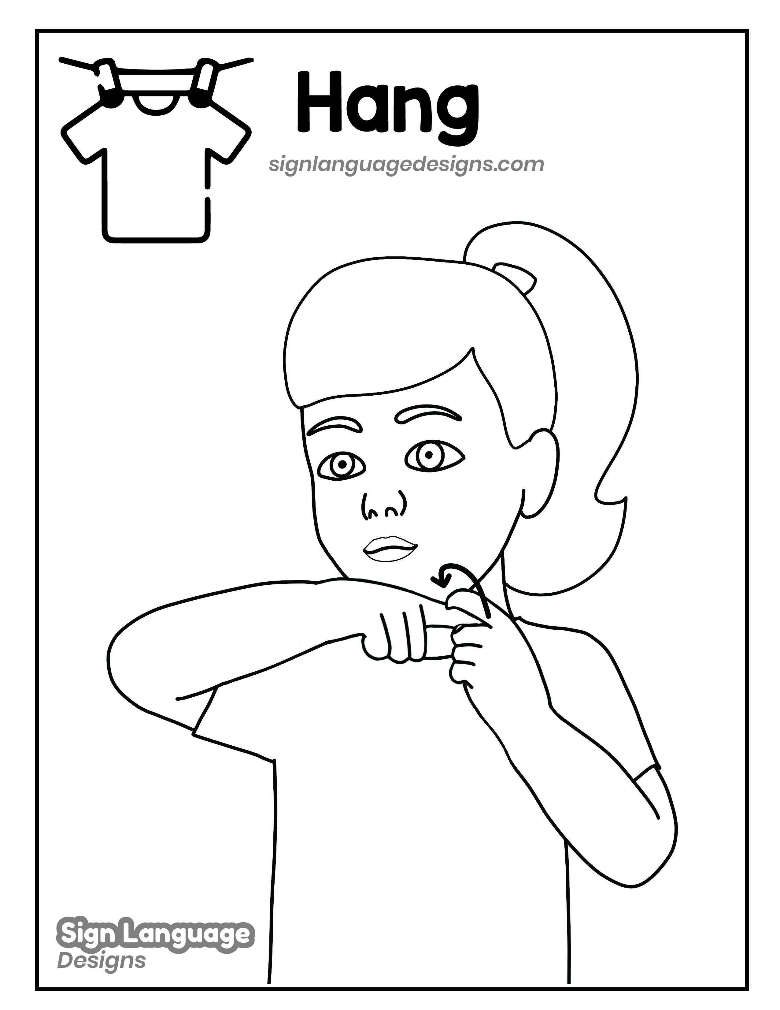 Free ASL sign poster featuring the ASL sign for the word hang. This is a black and white poster which is both printer-friendly and also can be used as a coloring page. You’ll find we have color versions available for free download too HERE!