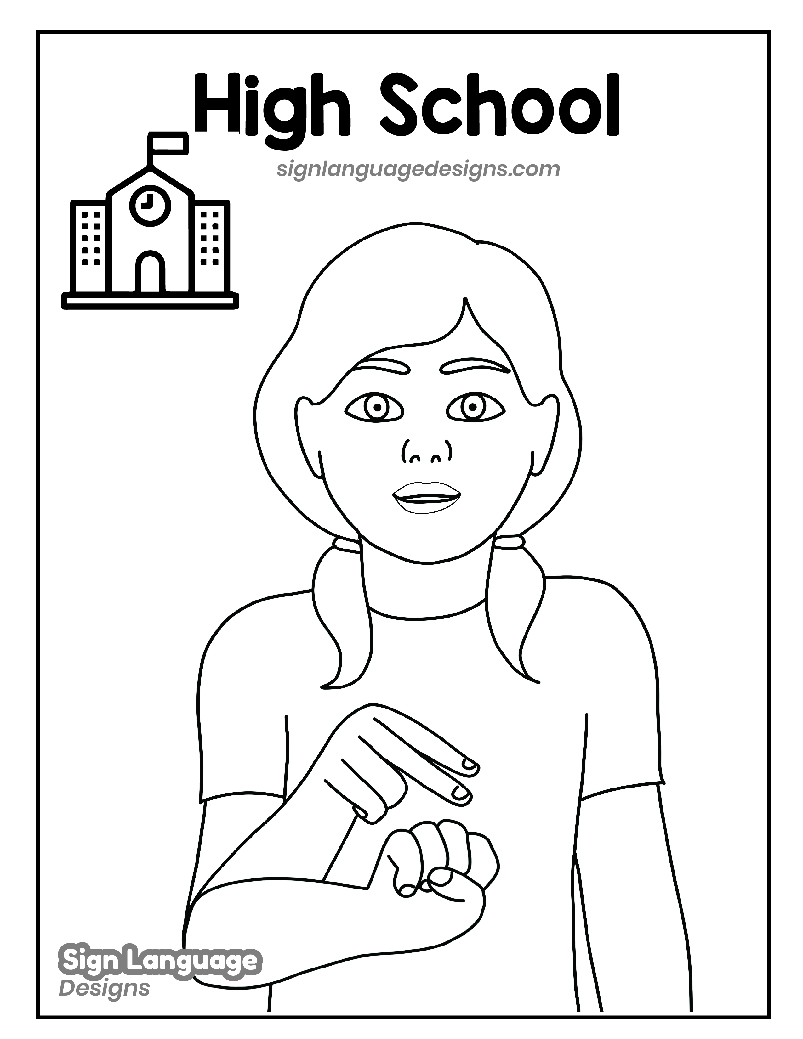 Free ASL sign poster featuring the ASL sign for the word high school. This is a black and white poster which is both printer-friendly and also can be used as a coloring page. You’ll find we have color versions available for free download too HERE!