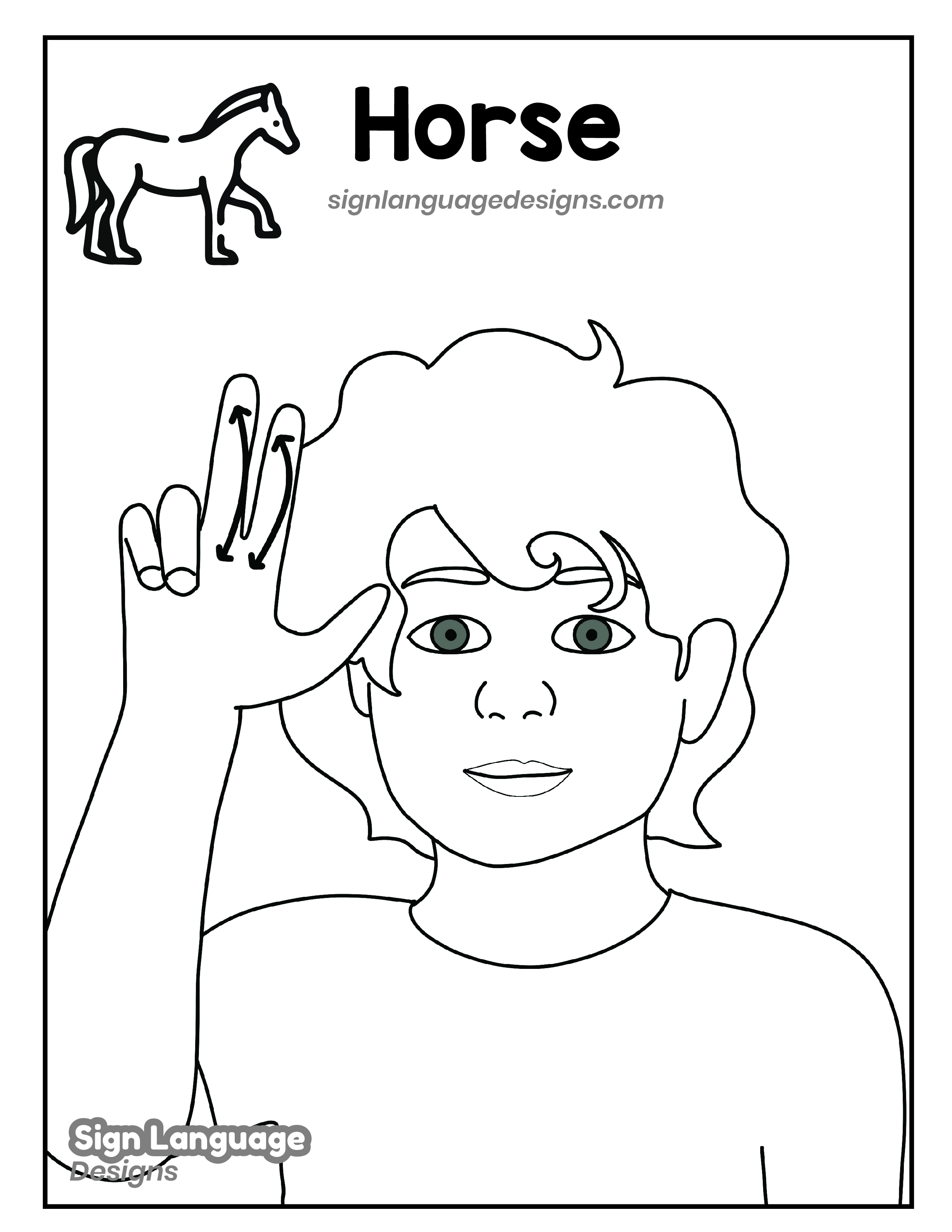 Free ASL sign poster featuring the ASL sign for the word horse. This is a black and white poster which is both printer-friendly and also can be used as a coloring page. You’ll find we have color versions available for free download too HERE!
