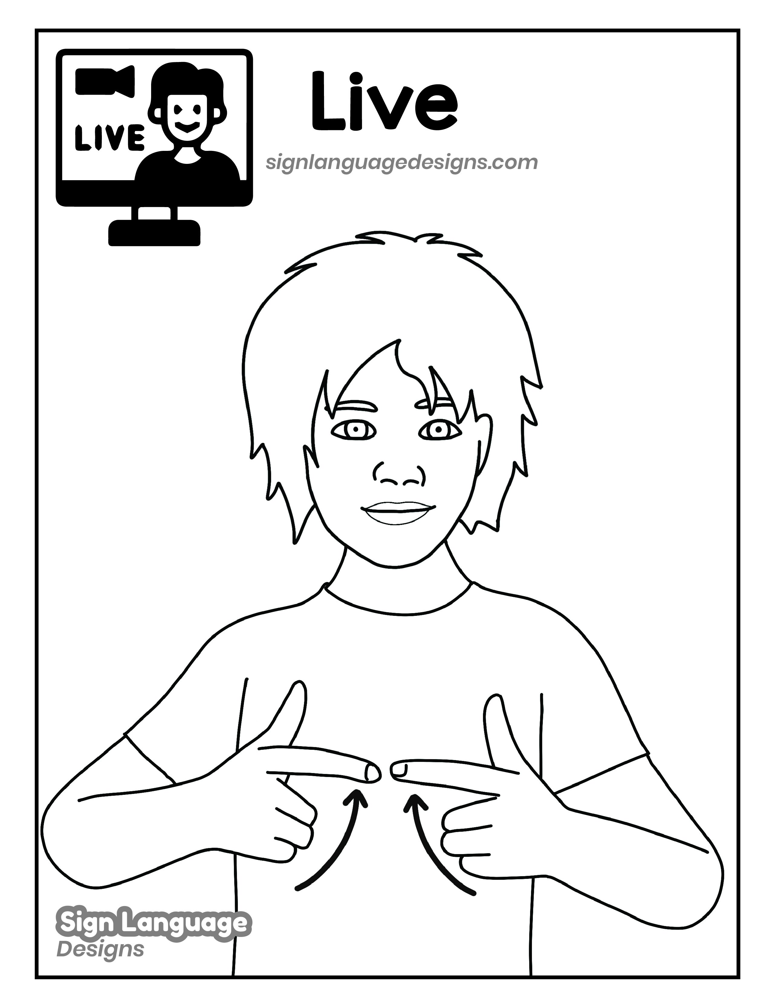 Free ASL sign poster featuring the ASL sign for the word LIVE. This is a black and white poster which is both printer-friendly and also can be used as a coloring page. You’ll find we have color versions available for free download too HERE!