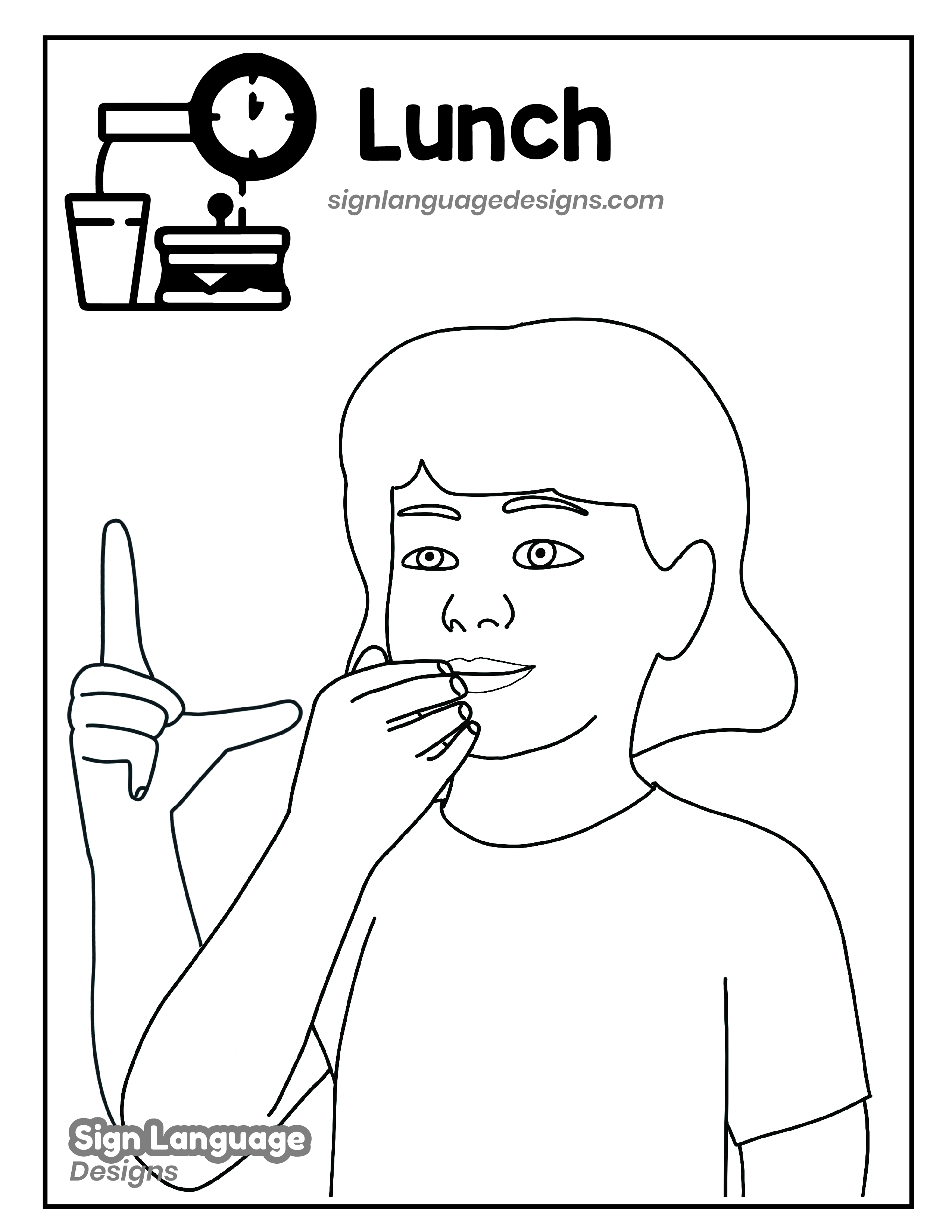 Free ASL sign poster featuring the ASL sign for the word LUNCH. This is a black and white poster which is both printer-friendly and also can be used as a coloring page. You’ll find we have color versions available for free download too HERE!