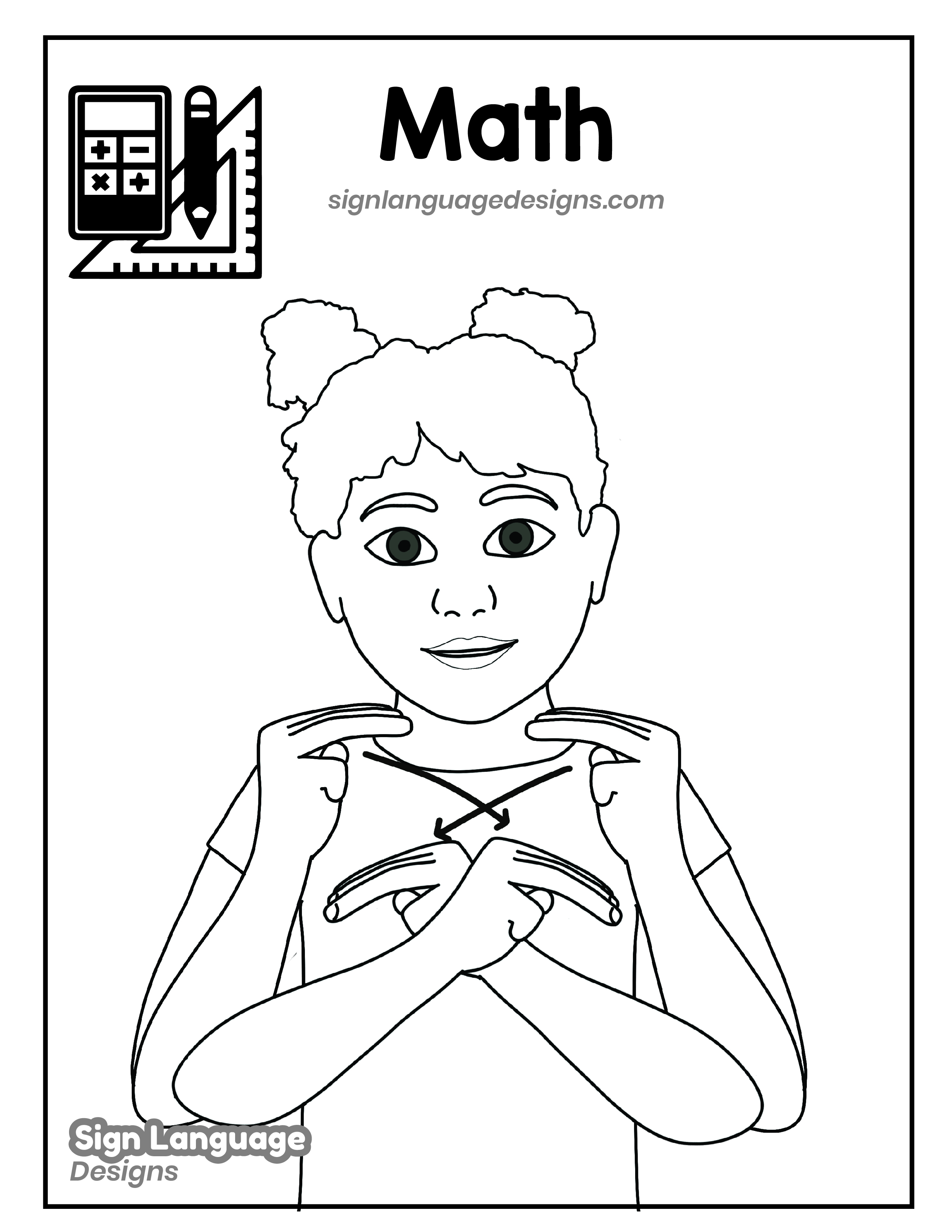 Free ASL sign poster featuring the ASL sign for the word MATH. This is a black and white poster which is both printer-friendly and also can be used as a coloring page. You’ll find we have color versions available for free download too HERE!