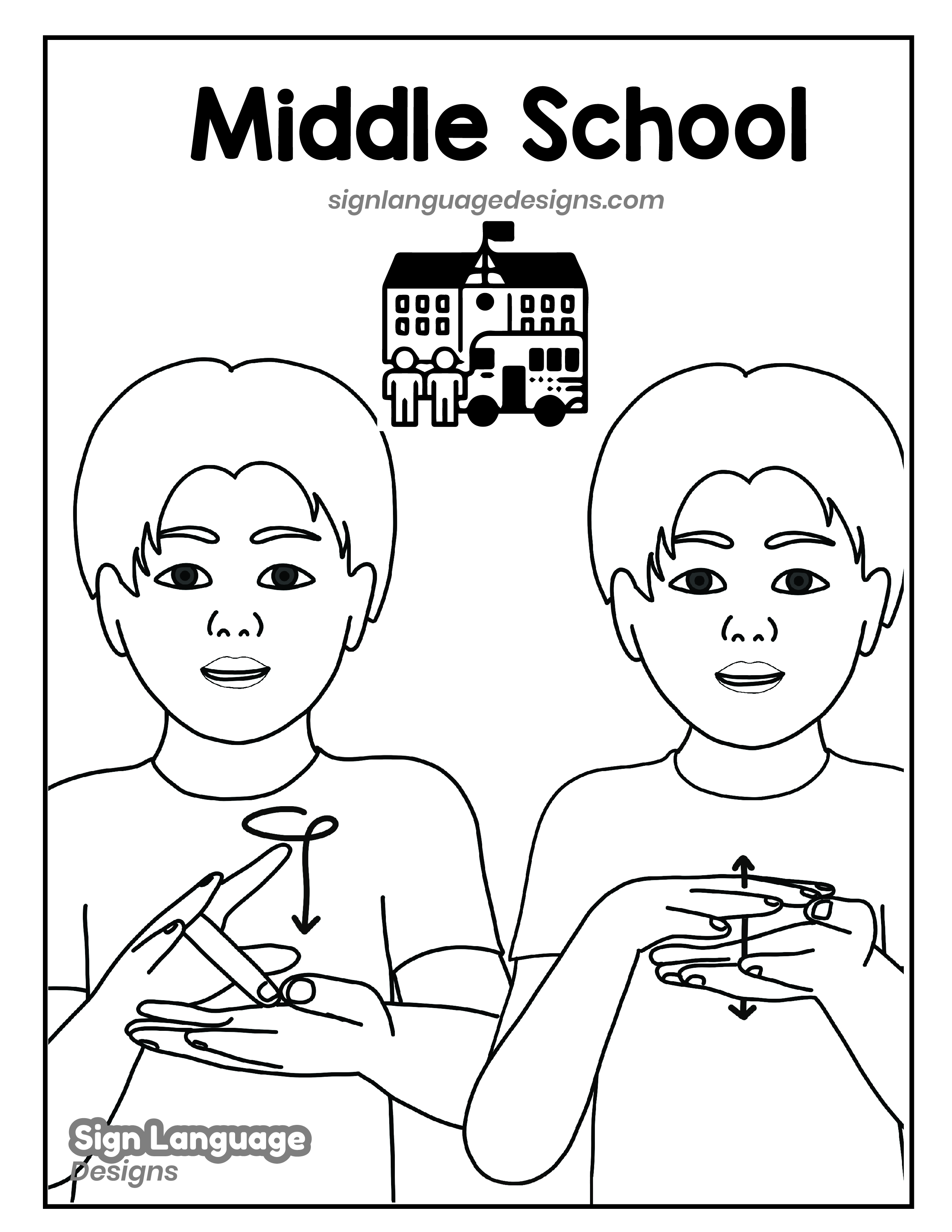 Free ASL sign poster featuring the ASL sign for the word MIDDLE SCHOOL. This is a black and white poster which is both printer-friendly and also can be used as a coloring page. You’ll find we have color versions available for free download too HERE!