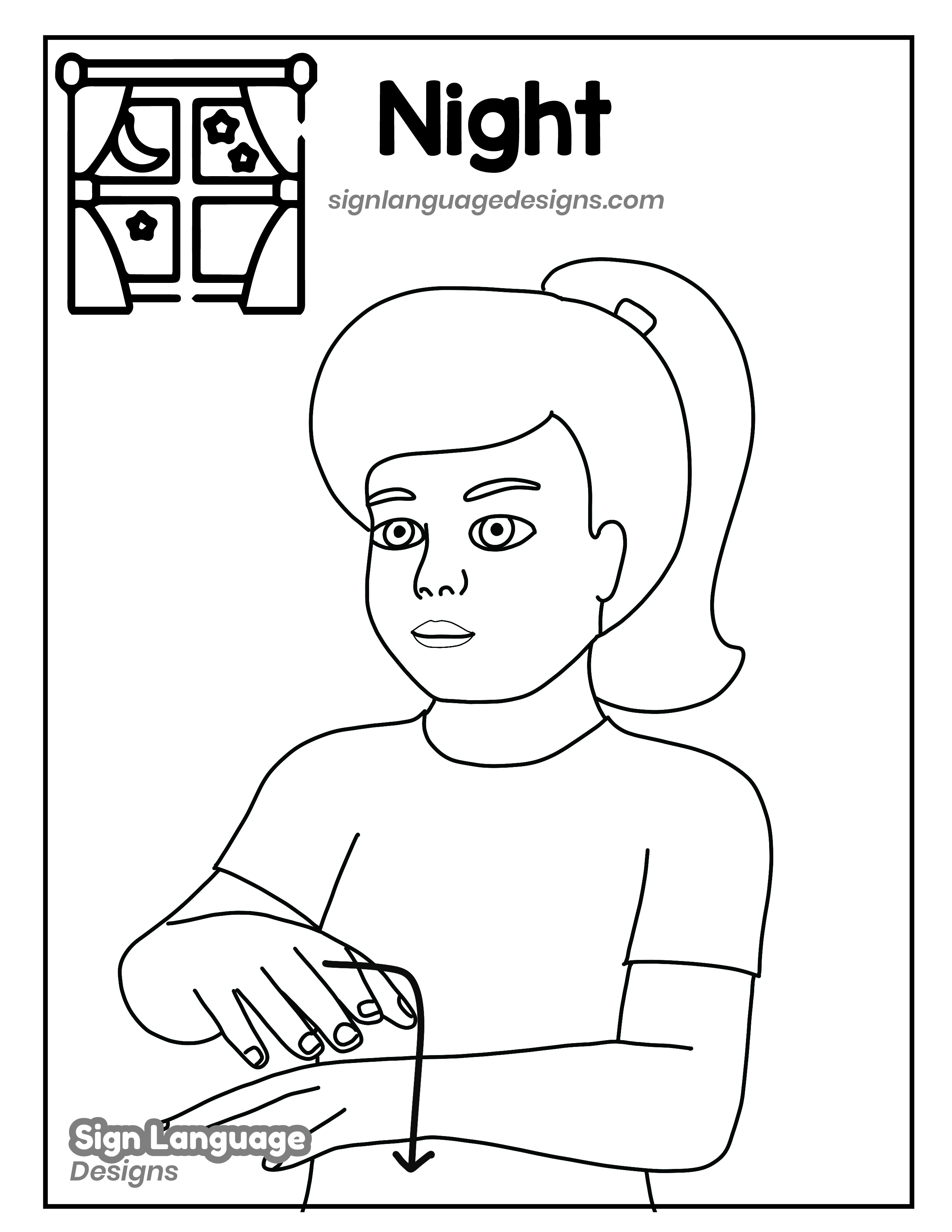 Free ASL sign poster featuring the ASL sign for the word NIGHT. This is a black and white poster which is both printer-friendly and also can be used as a coloring page. You’ll find we have color versions available for free download too HERE!