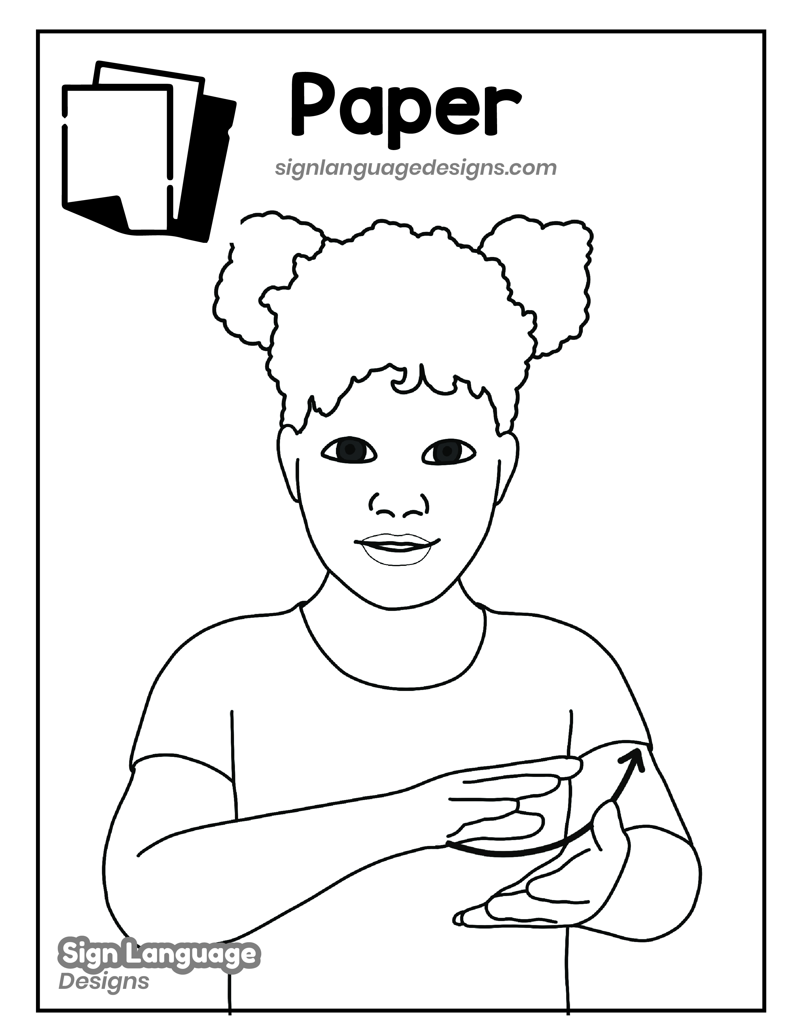 Free ASL sign poster featuring the ASL sign for the word PAPER. This is a black and white poster which is both printer-friendly and also can be used as a coloring page. You’ll find we have color versions available for free download too HERE!
