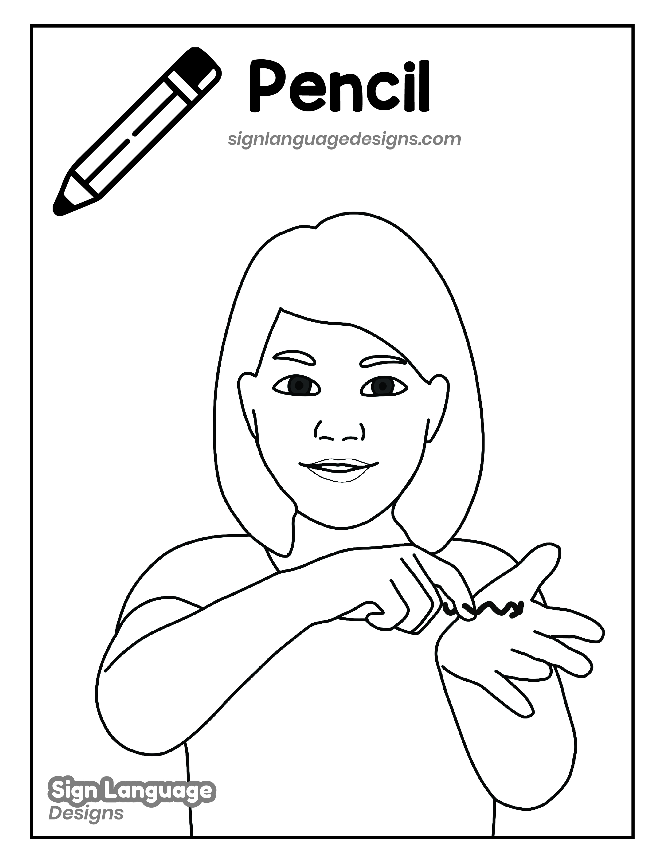 Free ASL sign poster featuring the ASL sign for the word PENCIL. This is a black and white poster which is both printer-friendly and also can be used as a coloring page. You’ll find we have color versions available for free download too HERE!