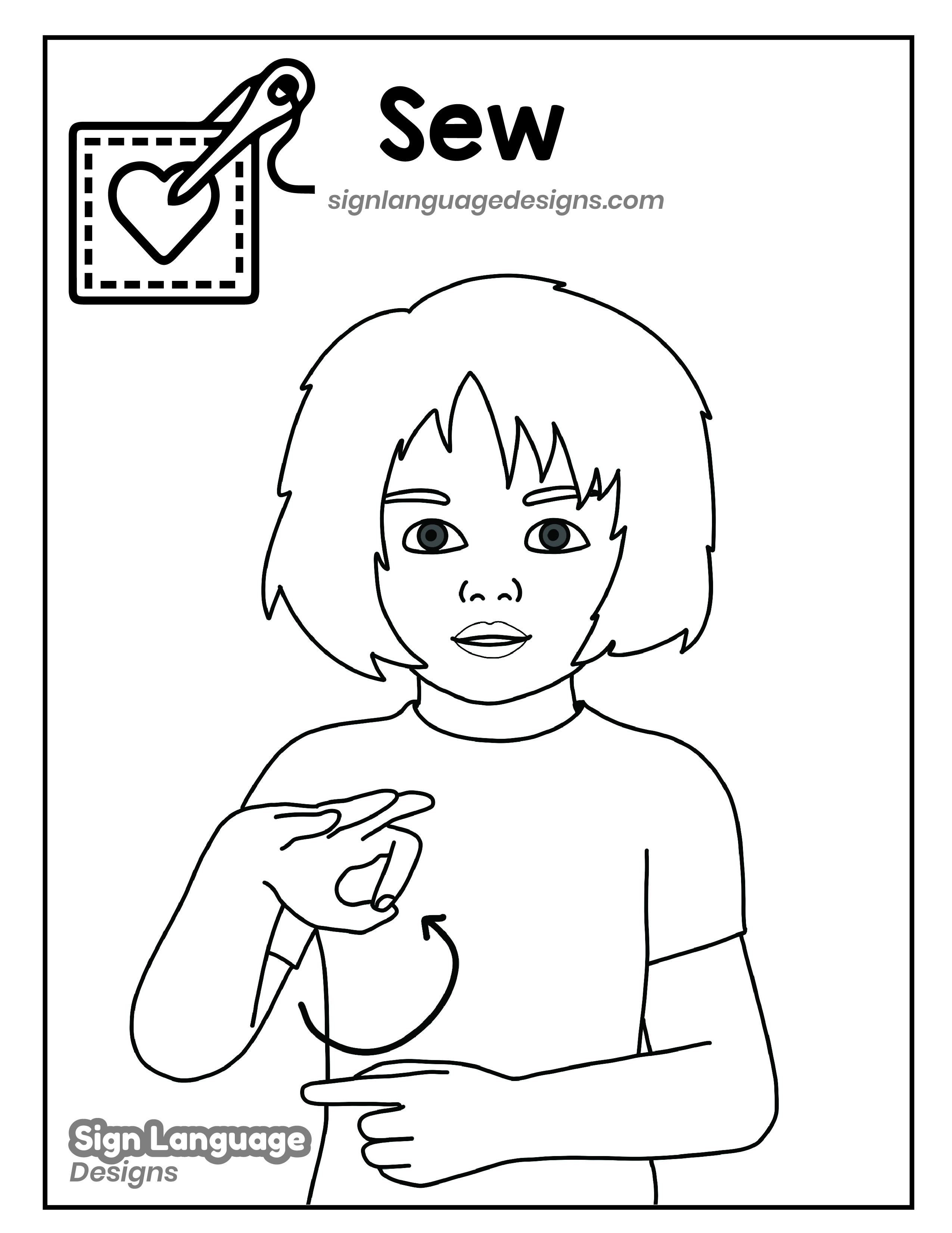 Free ASL sign poster featuring the ASL sign for the word SEW. This is a black and white poster which is both printer-friendly and also can be used as a coloring page. You’ll find we have color versions available for free download too HERE!