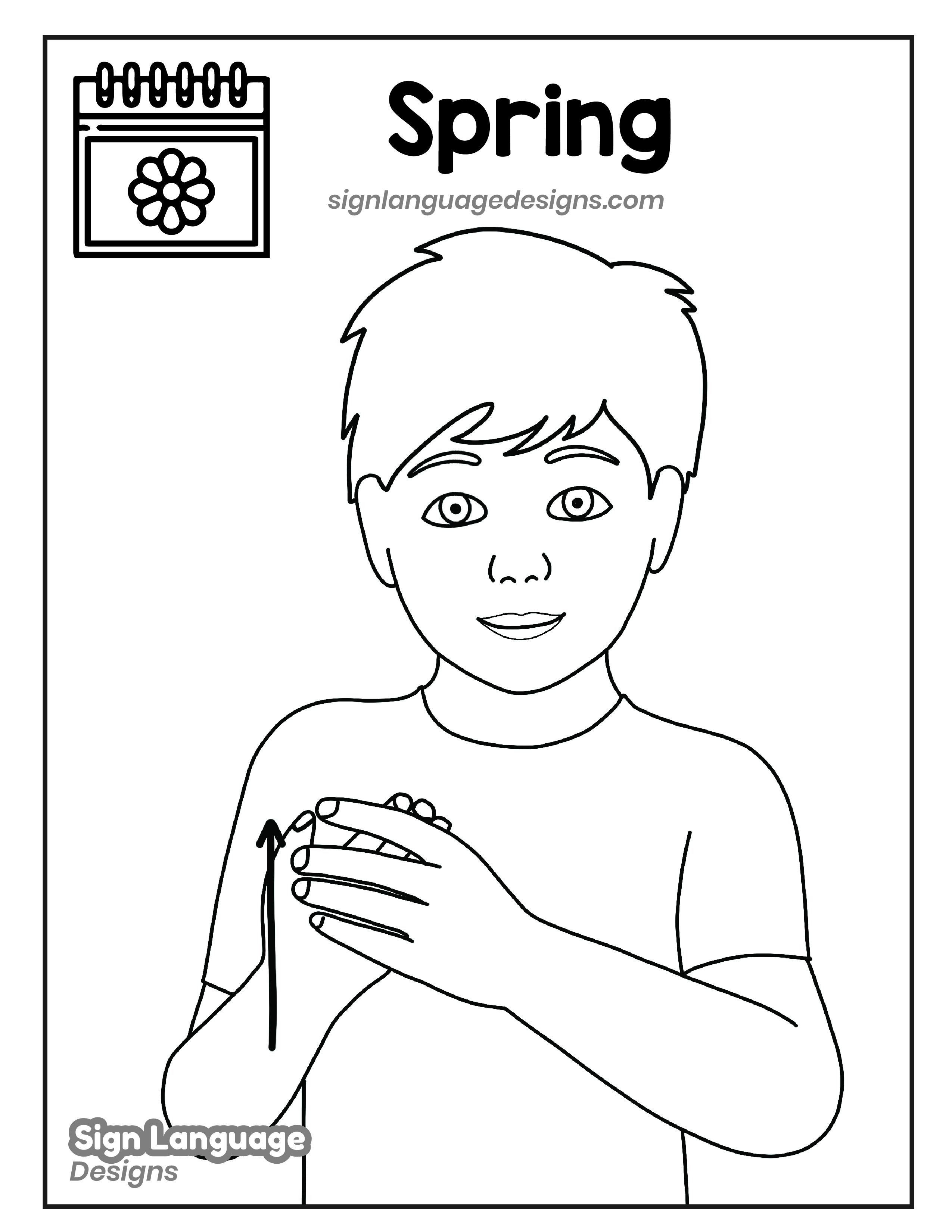Free ASL sign poster featuring the ASL sign for the word SPRING. This is a black and white poster which is both printer-friendly and also can be used as a coloring page. You’ll find we have color versions available for free download too HERE!